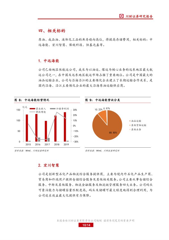 报告最后分析了与原油相关的液体化工品库存可能面临饱和的风险,并推荐了受益于国内原油储备工程建设及储罐运营的企业,例如中油工程、石化油服、海油工程、中远海能、宏川智慧、保税科技和恒基达鑫等。 报告同时对这些企业的经营情况进行了简要分析,并提供了相应的图表数据。