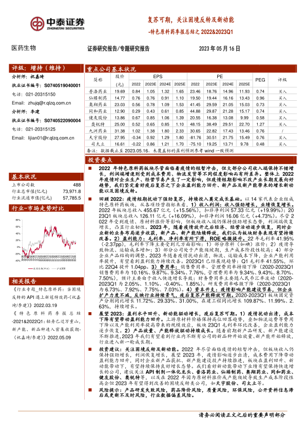 医药生物专题研究报告:特色原料药季报总结之2022&2023Q1-复苏可期,关注困境反转及新动能