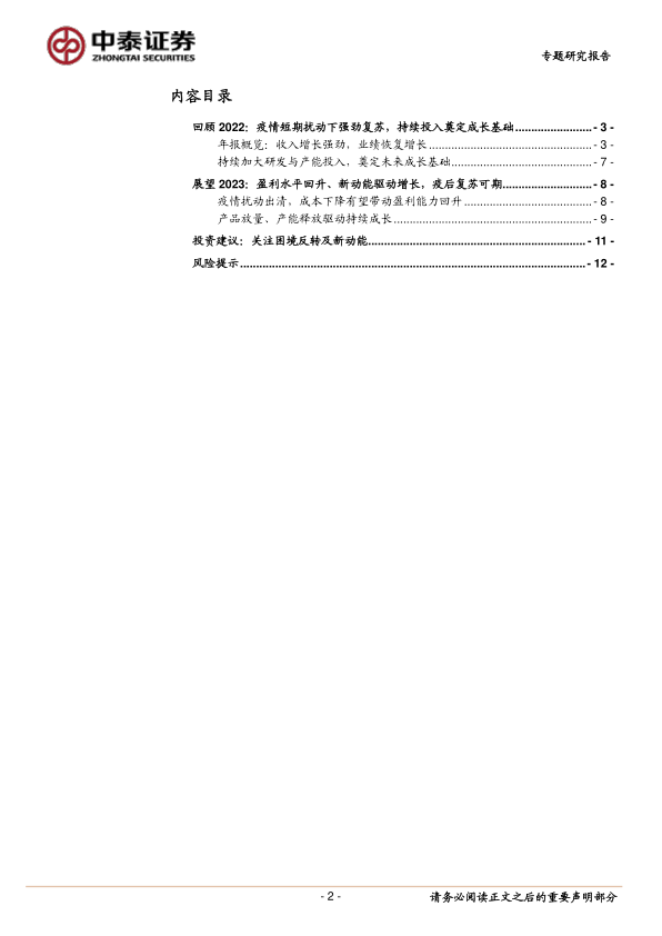 展望2023:盈利水平回升、新动能驱动增长,疫后复苏可期。1)疫情扰动出清,成本下降有望带动盈利能力回升。上游原材料价格保持高位回落趋势,叠加物流运费等费用下降以及产能利用率提高带来的规模效应,板块23Q1毛利率环比改善,企业盈利能力逐步恢复。2)产品放量、产能释放驱动持续成长。随着前期新产品研发、新产能建设不断推进,2023年我们有望看到行业内不断有公司的新品种开始放量、新产能开始释放,行业进入新一轮成长期。