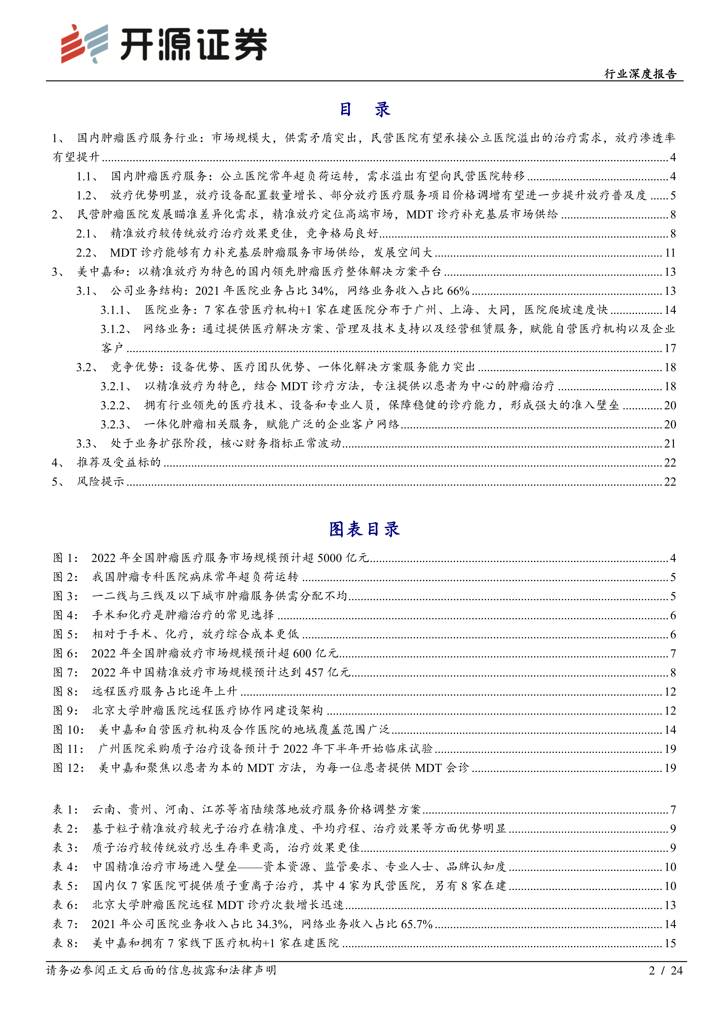 本报告的核心观点是:中国肿瘤医疗服务市场规模巨大,供需矛盾突出,民营医院凭借差异化发展战略,尤其是在精准放疗和MDT诊疗方面,有望承接公立医院溢出的治疗需求,并获得快速发展。美中嘉和作为一家以精准放疗为特色的肿瘤医疗整体解决方案平台,凭借其技术、设备和团队优势,以及积极的业务扩张策略,有望在市场竞争中脱颖而出。