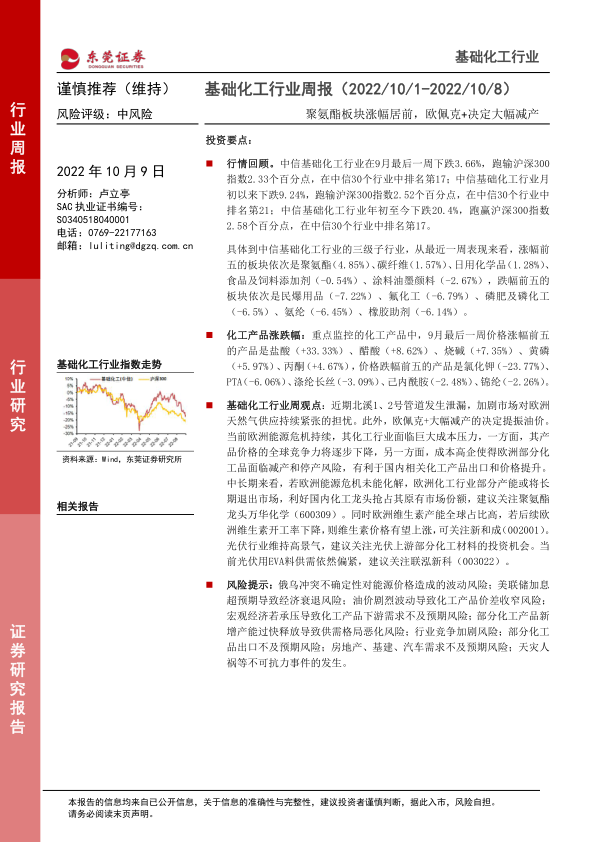 基础化工行业周观点: 近期北溪1、 2号管道发生泄漏, 加剧市场对欧洲天然气供应持续紧张的担忧。 此外, 欧佩克+大幅减产的决定提振油价。当前欧洲能源危机持续, 其化工行业面临巨大成本压力, 一方面, 其产品价格的全球竞争力将逐步下降, 另一方面, 成本高企使得欧洲部分化工品面临减产和停产风险, 有利于国内相关化工产品出口和价格提升。中长期来看, 若欧洲能源危机未能化解, 欧洲化工行业部分产能或将长期退出市场, 利好国内化工龙头抢占其原有市场份额, 建议关注聚氨酯龙头万华化学( 600309) 。 同时欧洲维生素产能全球占比高, 若后续欧洲维生素开工率下降, 则维生素价格有望上涨, 可关注新和成 ( 002001)。光伏行业维持高景气, 建议关注光伏上游部分化工材料的投资机会。 当前光伏用EVA料供需依然偏紧, 建议关注联泓新科( 003022) 。