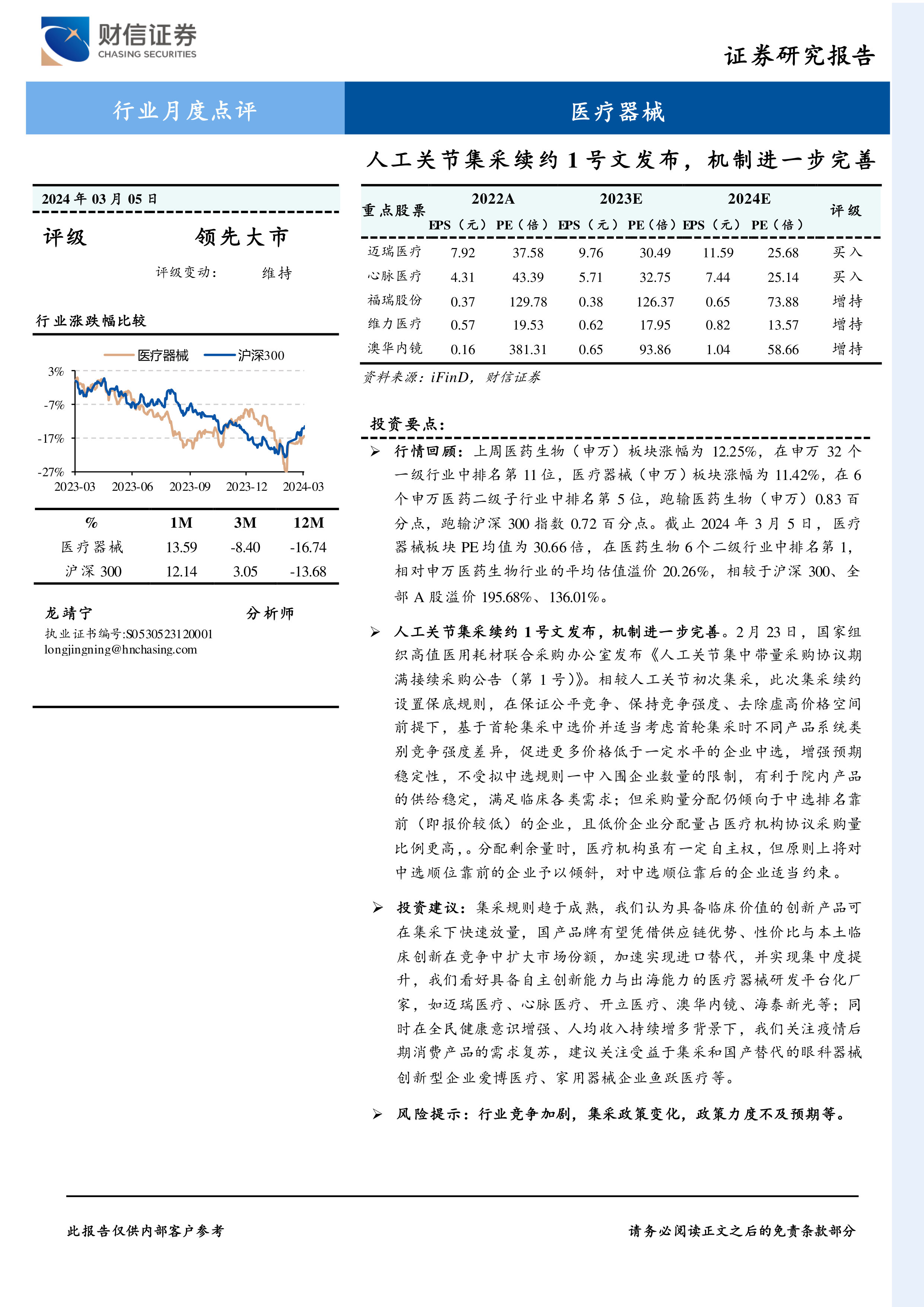 本报告通过对2024年3月5日之前医疗器械行业市场行情、人工关节集采续约政策以及重点公司动态的分析,得出结论:人工关节集采续约政策的完善将进一步促进医疗器械行业国产替代进程,并提升行业集中度。具备自主创新能力和出海能力的研发平台化企业将从中受益。然而,集采政策的变化以及行业竞争加剧仍是行业面临的主要风险。投资者需谨慎决策。