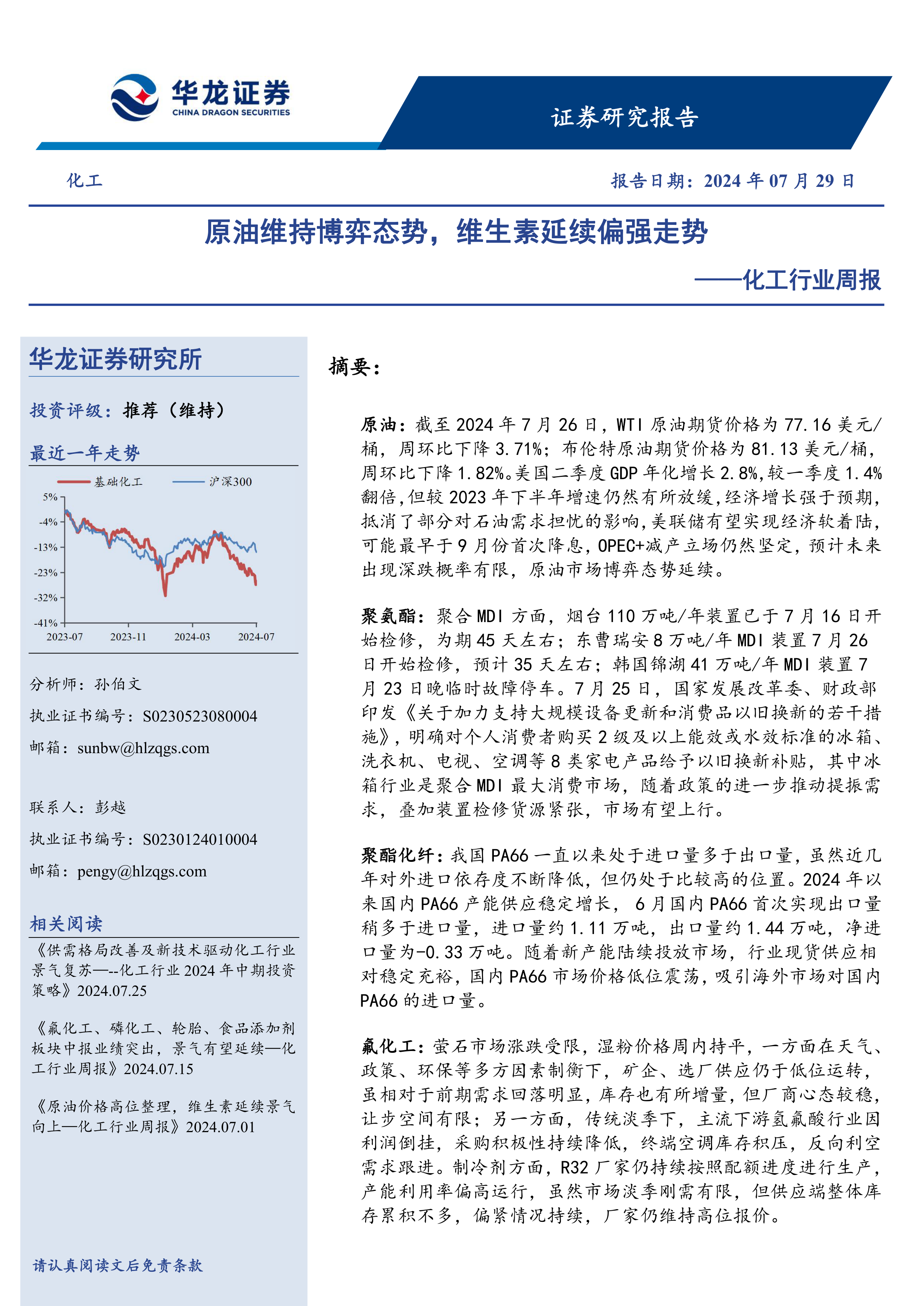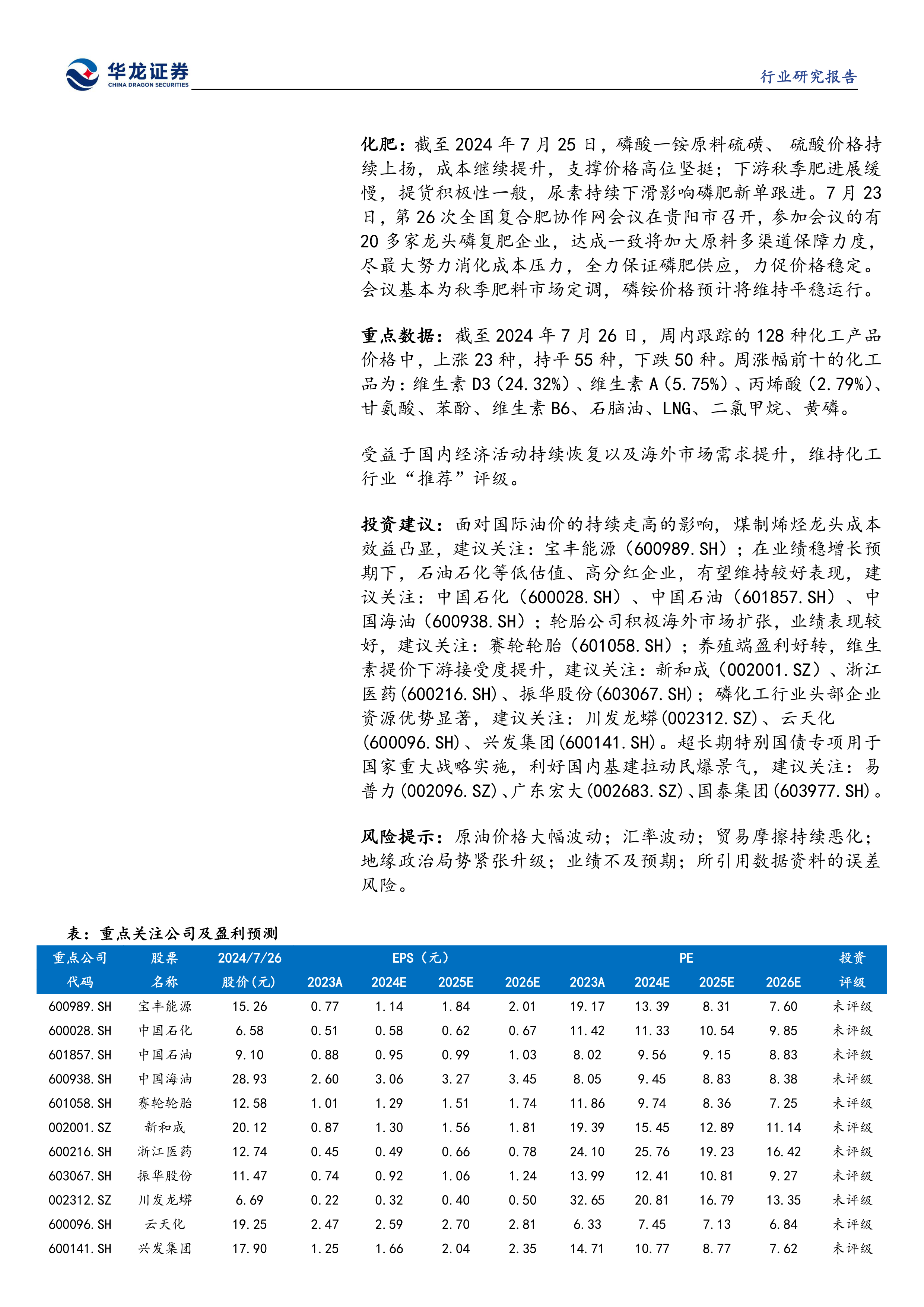 本报告基于公开数据,对2024年7月22日至26日一周内化工行业市场表现及关键数据进行了全面分析。报告指出,原油市场维持博弈态势,短期内深跌概率有限;维生素等部分化工产品价格上涨,而液氯、尿素等产品价格下跌;部分化工细分领域受政策利好或产能调整影响,价格波动显著。华龙证券研究所维持化工行业“推荐”评级,并推荐关注宝丰能源、中国石化、中国石油、中国海油、赛轮轮胎、新和成、浙江医药、振华股份、川发龙蟒、云天化、兴发集团、易普力、广东宏大、国泰集团等公司。 报告同时提示了原油价格波动、汇率波动、贸易摩擦、地缘政治风险、业绩不及预期以及数据误差等风险。 投资者应谨慎参考本报告,并结合自身情况做出投资决策。