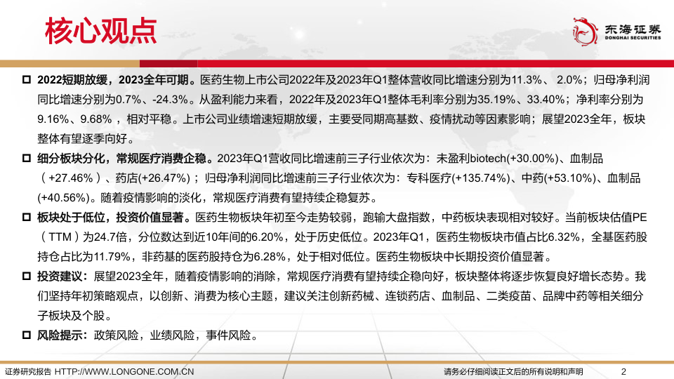 本报告的核心观点是:2022年医药生物行业整体增速放缓,但2023年全年有望企稳回升。短期放缓主要受疫情扰动、高基数效应和集采政策等因素影响。细分板块表现分化,常规医疗消费逐步复苏,创新药械、连锁药店、血制品、二类疫苗、品牌中药等细分领域表现相对较好。目前板块估值处于历史低位,投资价值显著。
