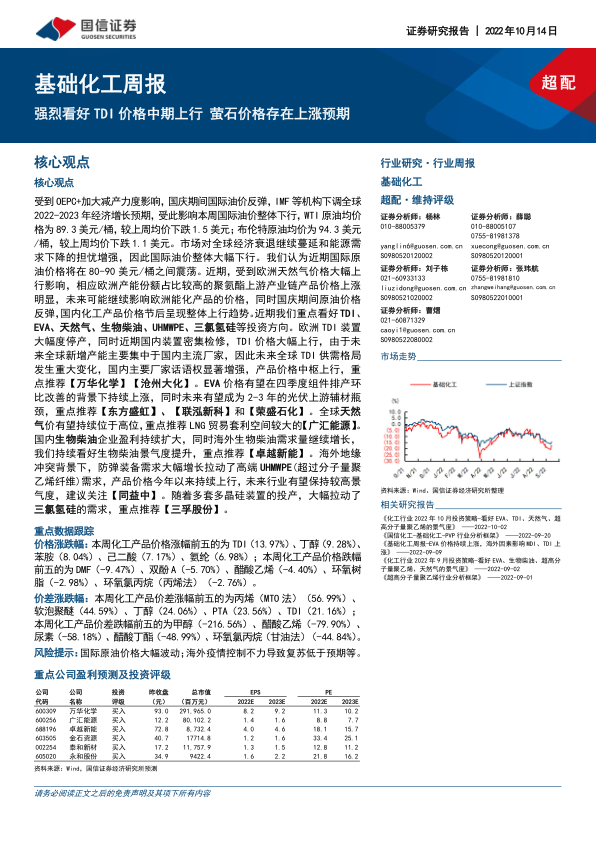 受到OEPC+加大减产力度影响,国庆期间国际油价反弹,IMF等机构下调全球2022-2023年经济增长预期,受此影响本周国际油价整体下行,WTI原油均价格为89.3美元/桶,较上周均价下跌1.5美元;布伦特原油均价为94.3美元/桶,较上周均价下跌1.1美元。市场对全球经济衰退继续蔓延和能源需求下降的担忧增强,因此国际油价整体大幅下行。我们认为近期国际原油价格将在80-90美元/桶之间震荡。近期,受到欧洲天然气价格大幅上行影响,相应欧洲产能份额占比较高的聚氨酯上游产业链产品价格上涨明显,未来可能继续影响欧洲能化产品的价格,同时国庆期间原油价格反弹,国内化工产品价格节后呈现整体上行趋势。近期我们重点看好TDI、EVA、天然气、生物柴油、UHMWPE、三氯氢硅等投资方向。欧洲TDI装置大幅度停产,同时近期国内装置密集检修,TDI价格大幅上行,由于未来全球新增产能主要集中于国内主流厂家,因此未来全球TDI供需格局发生重大变化,国内主要厂家话语权显著增强,产品价格中枢上行,重点推荐【万华化学】【沧州大化】。EVA价格有望在四季度组件排产环比改善的背景下持续上涨,同时未来有望成为2-3年的光伏上游辅材瓶颈,重点推荐【东方盛虹】、【联泓新科】和【荣盛石化】。全球天然气价有望持续位于高位,重点推荐LNG贸易套利空间较大的【广汇能源】。国内生物柴油企业盈利持续扩大,同时海外生物柴油需求量继续增长,我们持续看好生物柴油景气度提升,重点推荐【卓越新能】。海外地缘冲突背景下,防弹装备需求大幅增长拉动了高端UHMWPE(超过分子量聚乙烯纤维)需求,产品价格今年以来持续上行,未来行业有望保持较高景气度,建议关注【同益中】。随着多套多晶硅装置的投产,大幅拉动了三氯氢硅的需求,重点推荐【三孚股份】。