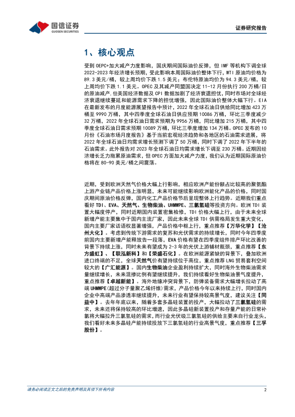 本报告的核心观点是:基于OPEC+减产、欧洲能源危机以及国内外经济形势变化,国际原油价格将在80-90美元/桶区间震荡。在此背景下,国内化工产品价格呈现分化,部分产品价格上涨,部分产品价格下跌。报告重点看好TDI、EVA、天然气、生物柴油、UHMWPE、三氯氢硅等投资方向,并推荐了相应的重点公司。