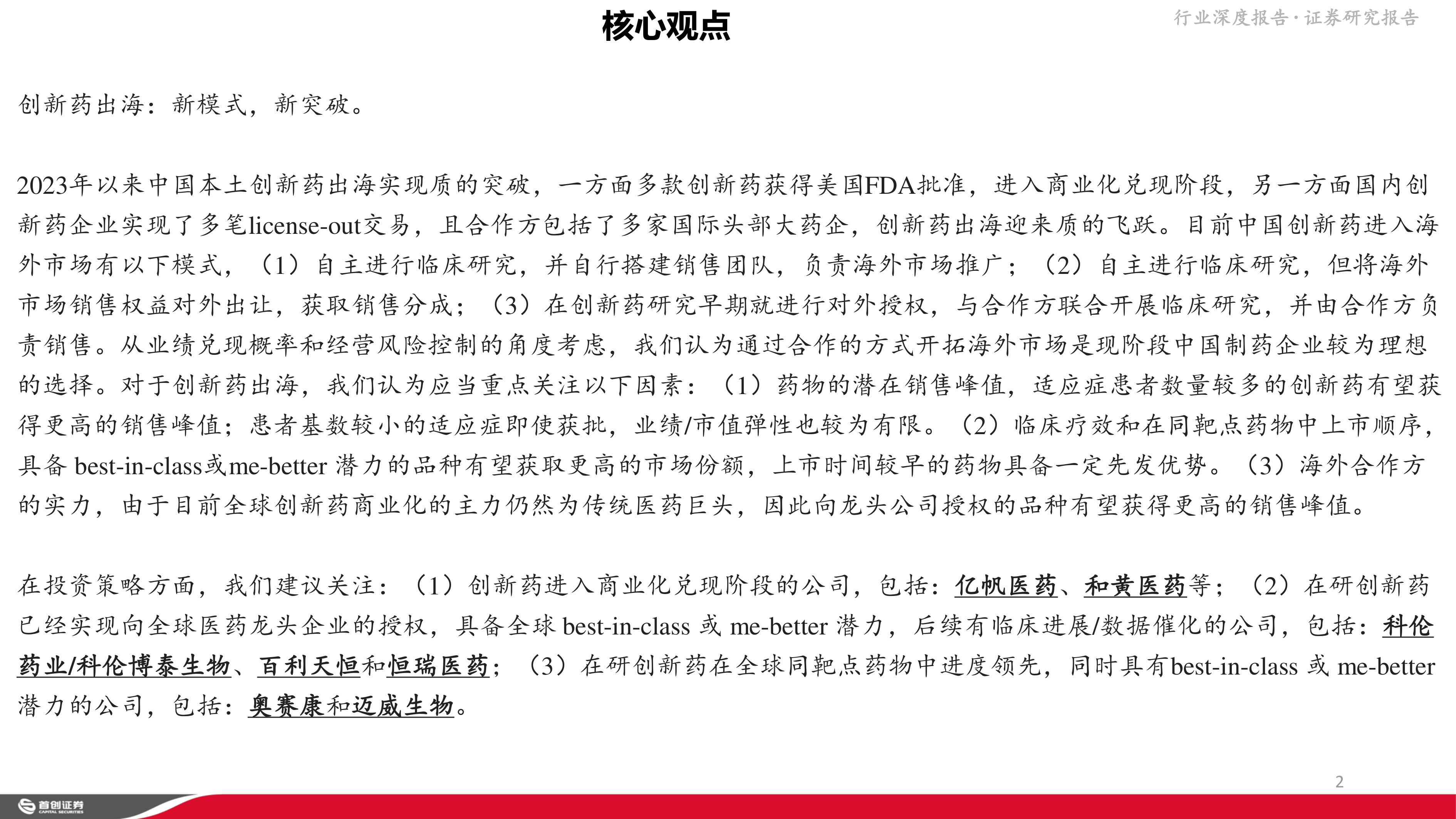 本报告的核心观点是:中国创新药和生物类似药出海正迎来新起点和新突破。创新药出海模式多样,合作模式更具优势;成功关键在于药物潜在销售峰值、临床疗效及上市顺序、以及海外合作方实力。生物类似药出海市场潜力巨大,美国市场增长迅速,首仿品种和获批顺序靠前的品种将率先受益。报告建议关注已进入商业化兑现阶段的公司、已向全球医药龙头授权且具备best-in-class或me-better潜力的公司,以及在研创新药在全球同靶点药物中进度领先的公司。