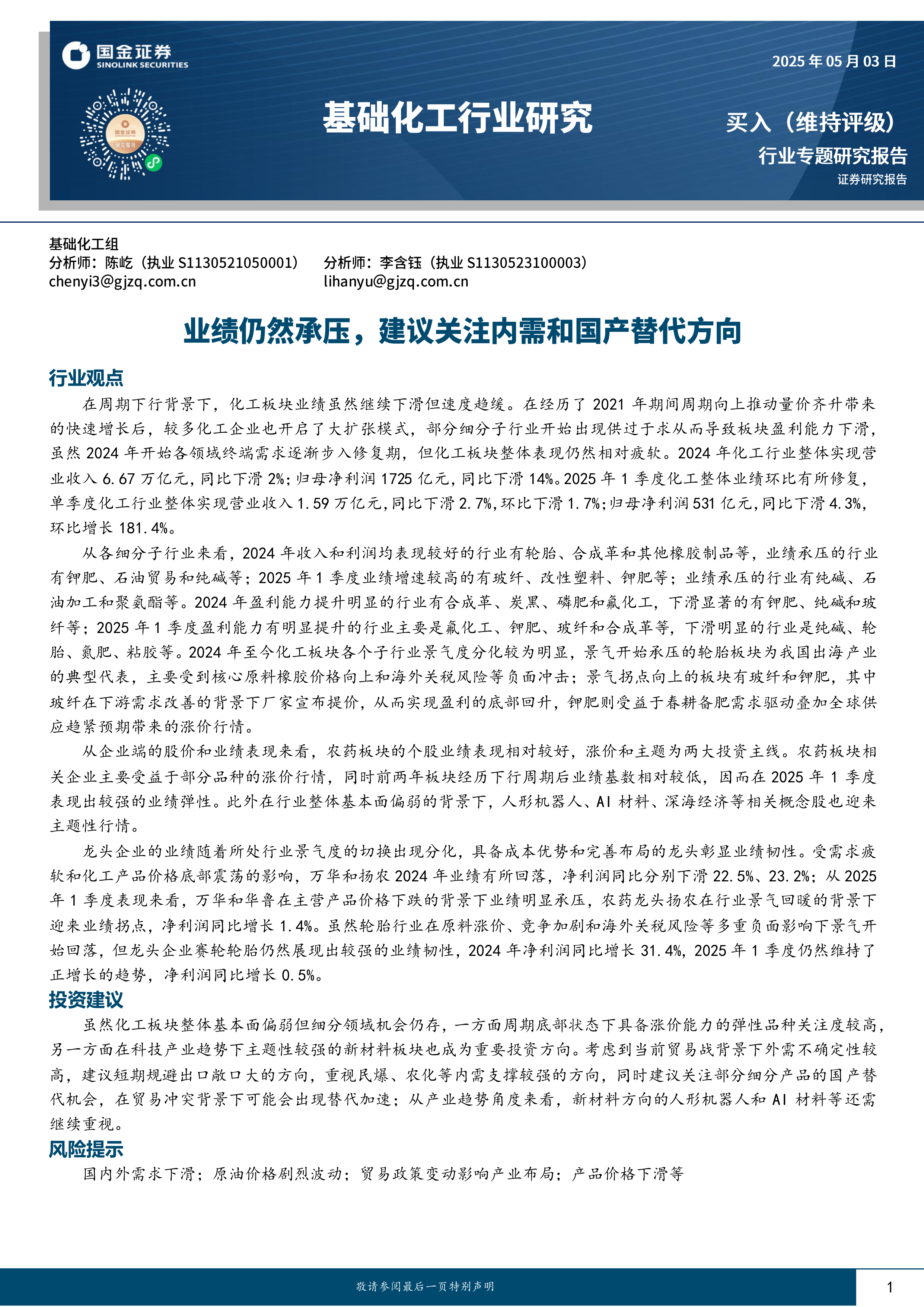 基础化工行业研究:业绩仍然承压,建议关注内需和国产替代方向
