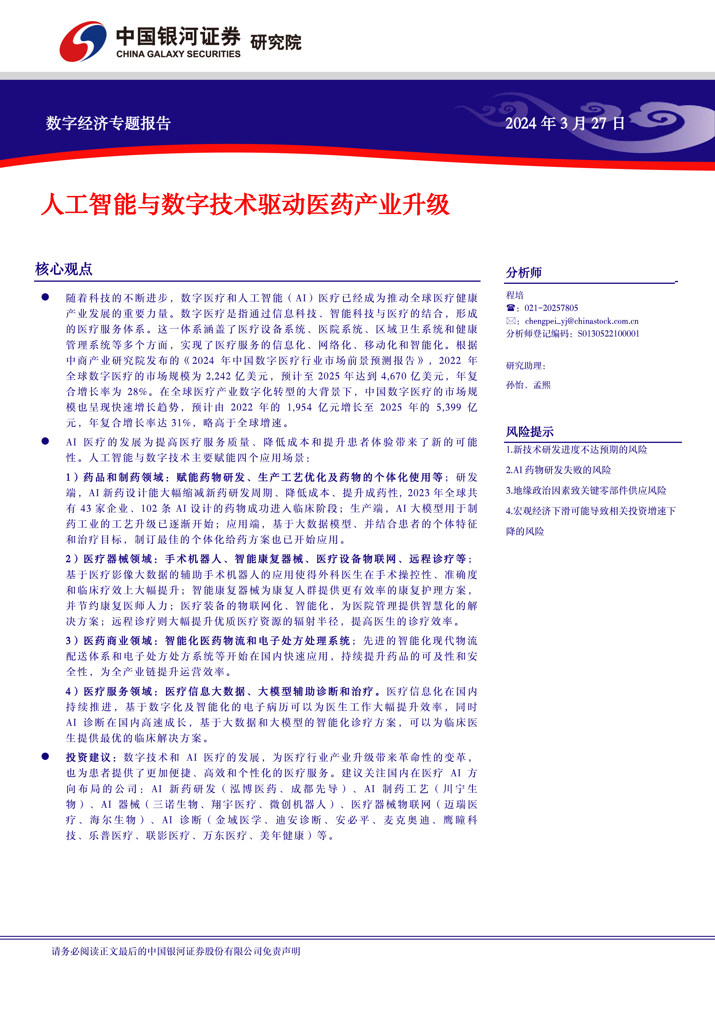 本报告系统地分析了人工智能和数字技术对医药产业升级的驱动作用,并对数字医疗市场规模、产业链各个环节的智能化升级以及相关政策进行了深入探讨。 报告指出,AI大模型的应用将进一步加速医药产业的数字化转型,并为患者提供更便捷、高效和个性化的医疗服务。 报告最后建议投资者关注国内在医疗AI方向布局的公司,但也提示了新技术研发、AI药物研发失败、关键零部件供应和宏观经济下滑等风险。 总而言之,本报告为投资者理解医药行业数字化转型趋势,以及识别潜在投资机会提供了有价值的参考。