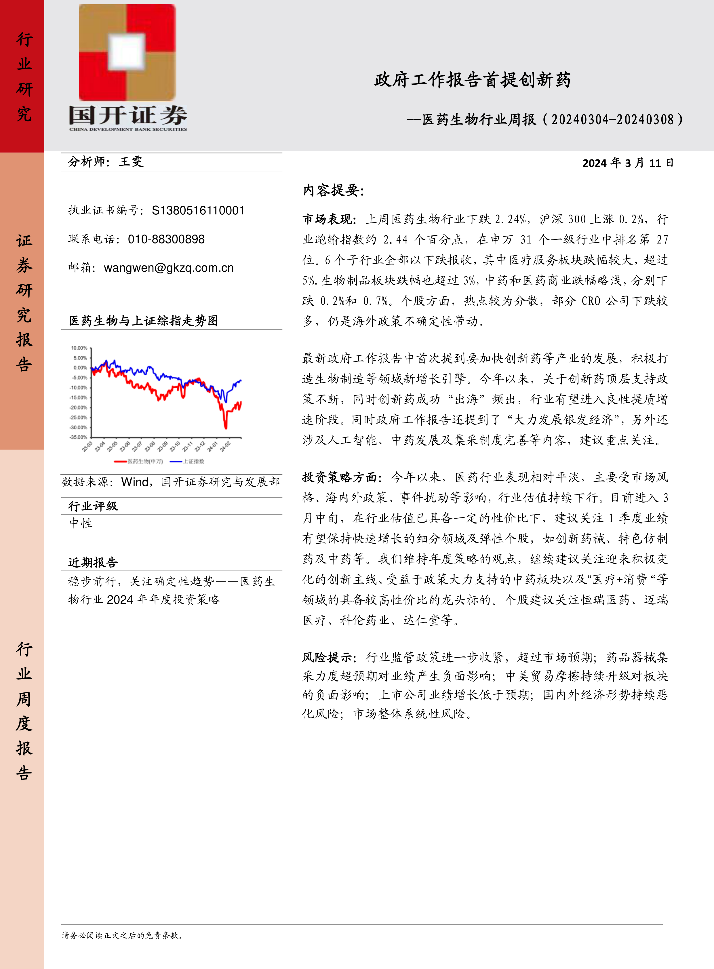 本报告的核心观点是:上周医药生物行业整体表现疲软,跑输大盘,但政府工作报告中首次提及加快创新药发展,为行业带来长期利好。短期来看,行业估值已具备一定性价比,建议关注业绩增长潜力较大的细分领域和个股,例如创新药械、特色仿制药和中药板块。