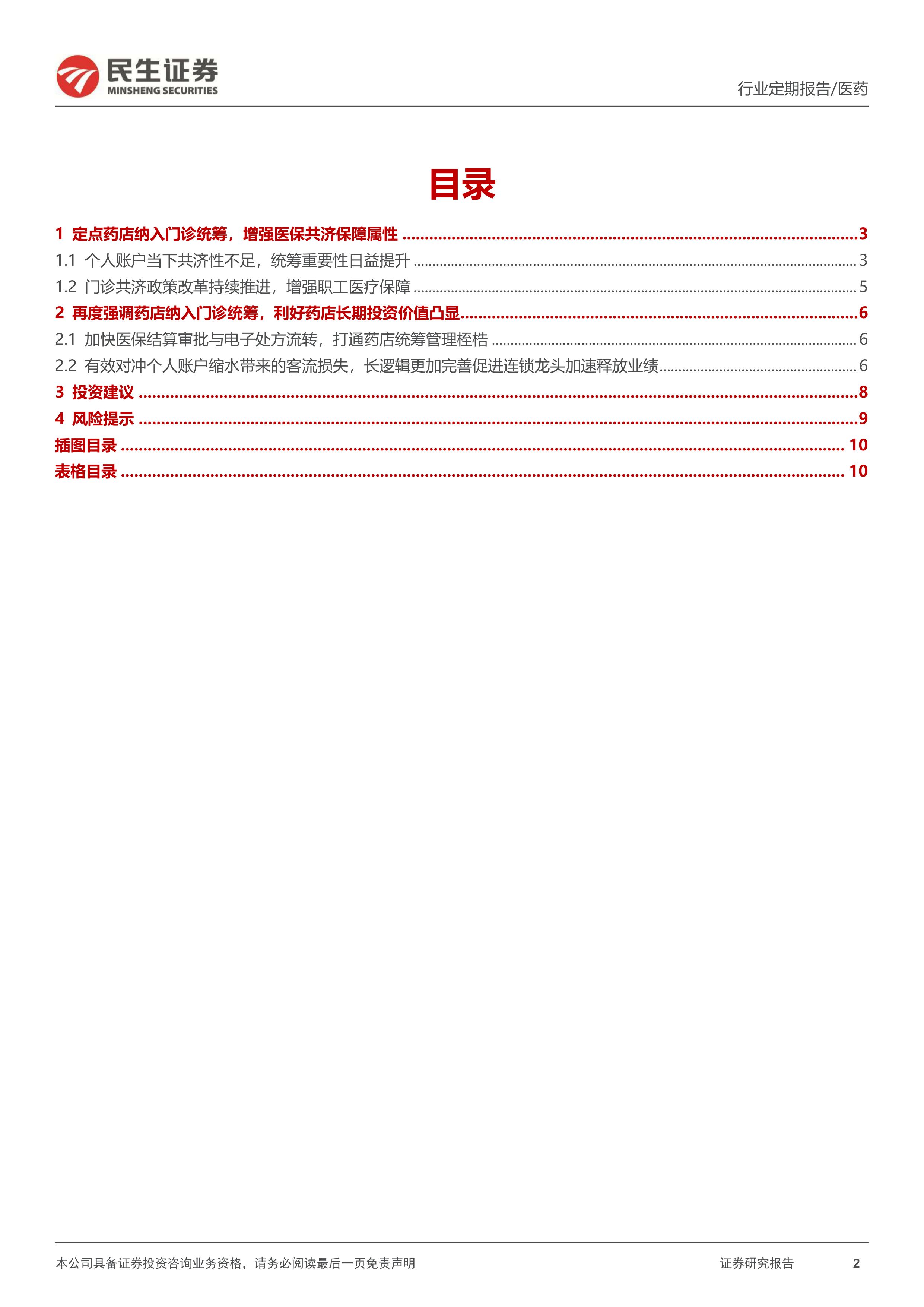 再度强调药店纳入门诊统筹,利好药店长期投资价值凸显2月15日,国家医保局发布《关于进一步做好定点零售药店纳入门诊统筹管理的通知》。要求:(1)从药店端,鼓励主动申请定点零售药房开通门诊统筹服务;(2)从医保端,完善定点零售药店门诊统筹支付政策及配套政策。药店作为个账资金的主要支出端,个人账户改革减少职工个人账户的资金来源,加大患者去药房购药的难度。虽然医院门诊可进行医保统筹报销,但便民度远低于药房,因此门诊统筹管理将有效弥补个账缩水带来的客流下降,同时我们认为药店纳入门诊统筹管理将使整个行业长期投资逻辑更加完善,药店收入结构将有持续良性改善,个人账户对收入的重要性逐步降低。