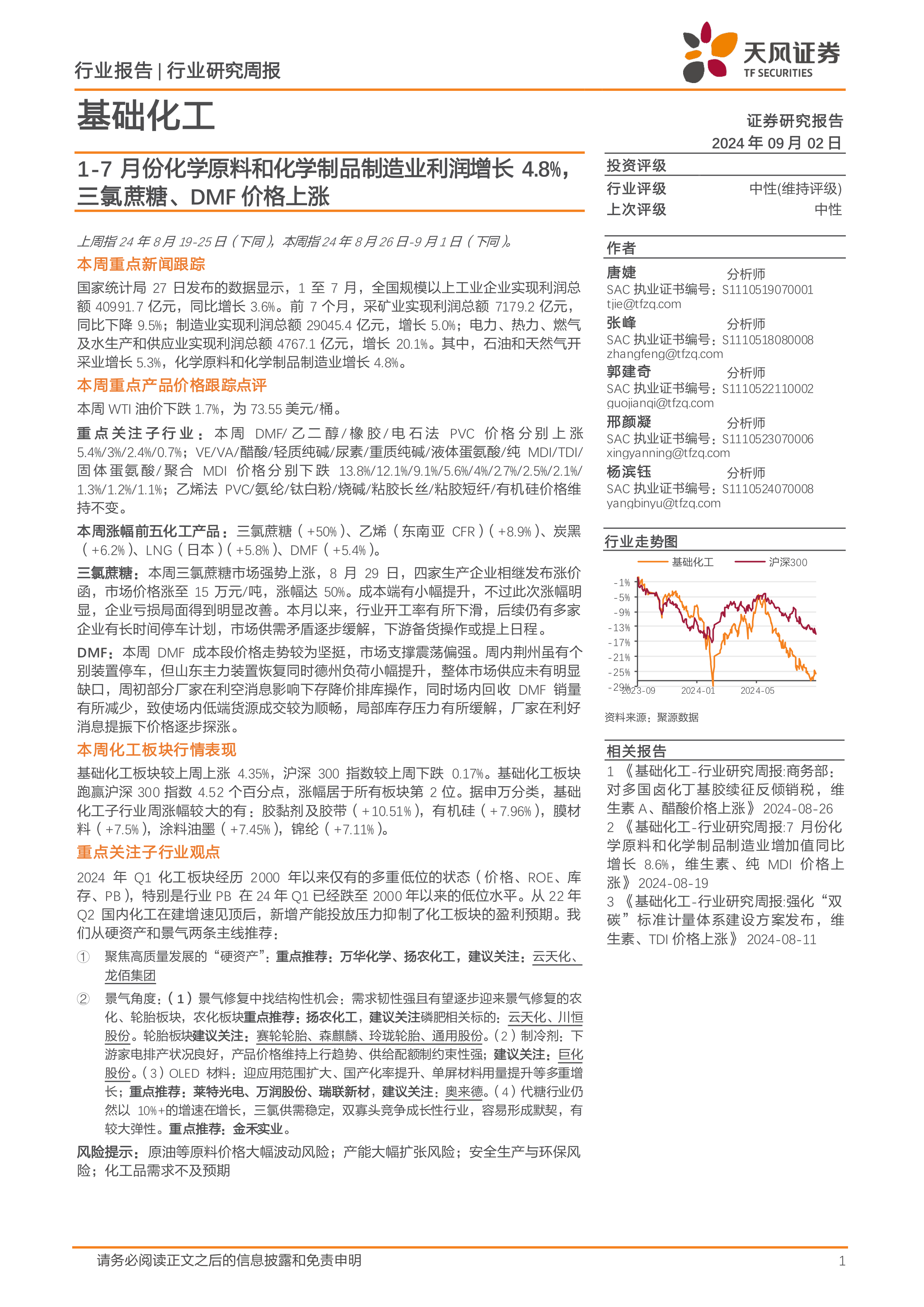 基础化工行业研究周报:1-7月份化学原料和化学制品制造业利润增长4.8%,三氯蔗糖、DMF价格上涨