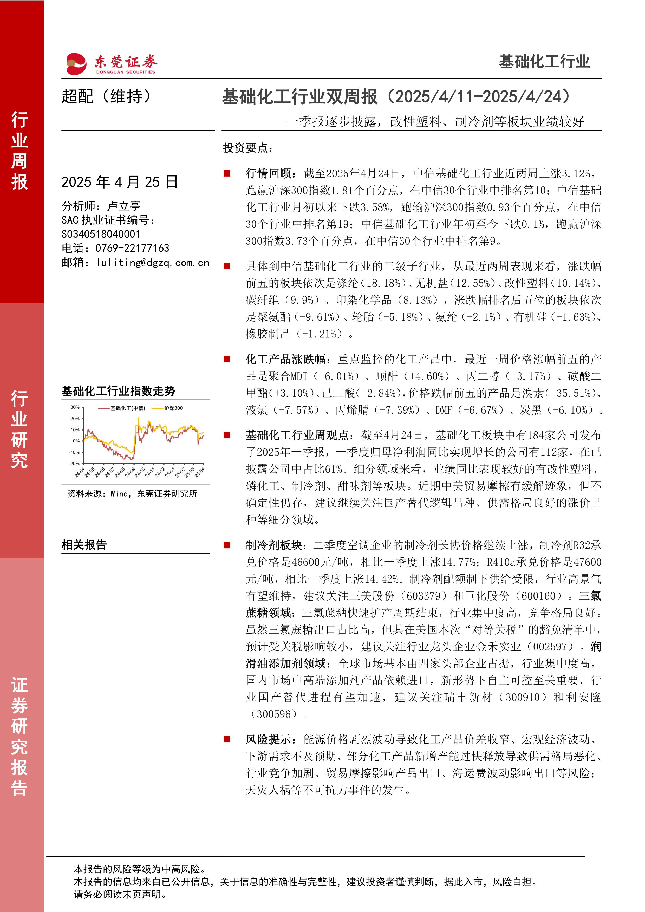 本报告的核心观点是:基础化工行业近期表现强劲,部分细分板块业绩突出,但仍面临诸多风险。