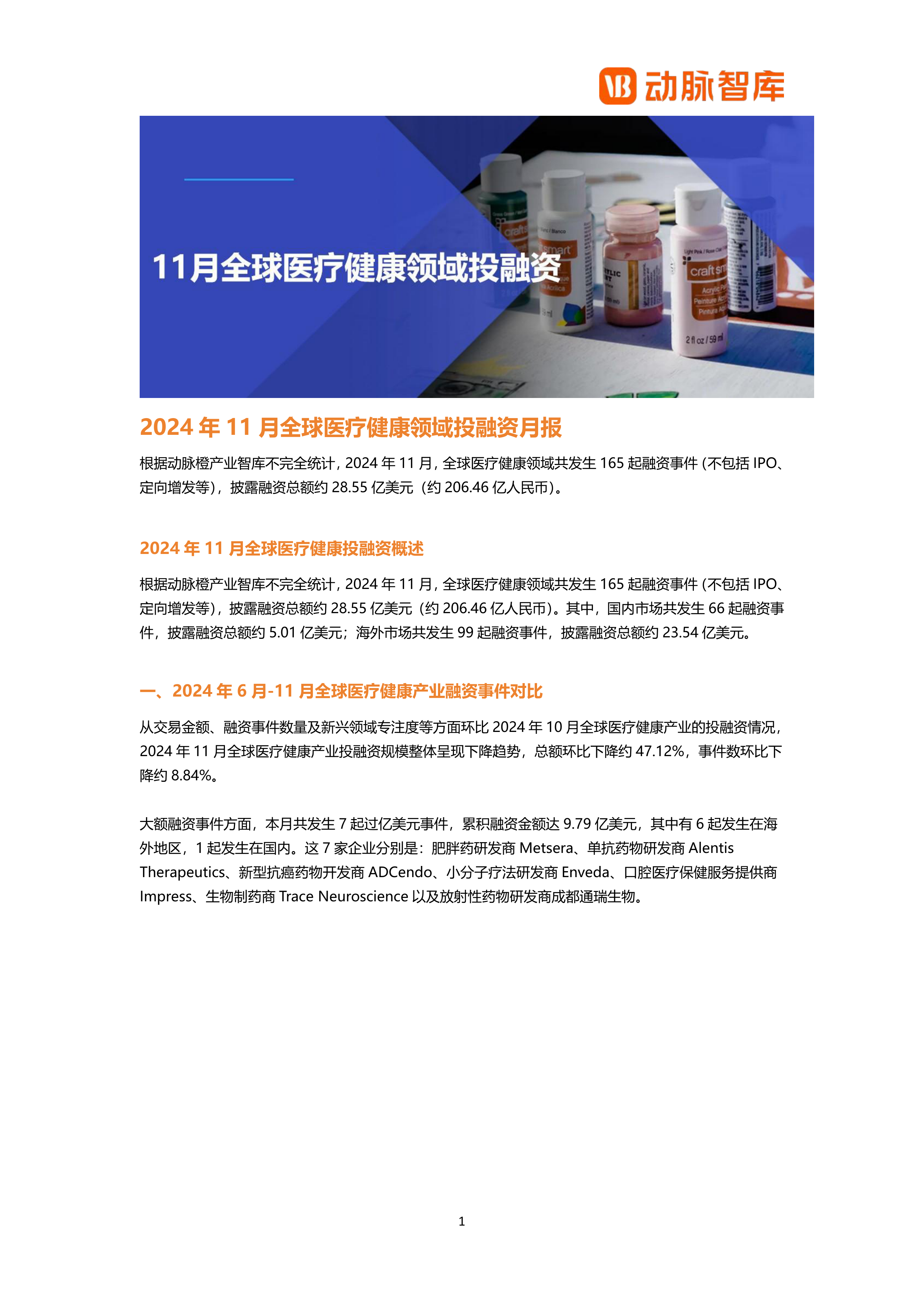 2024年11月全球医疗健康领域投融资月报