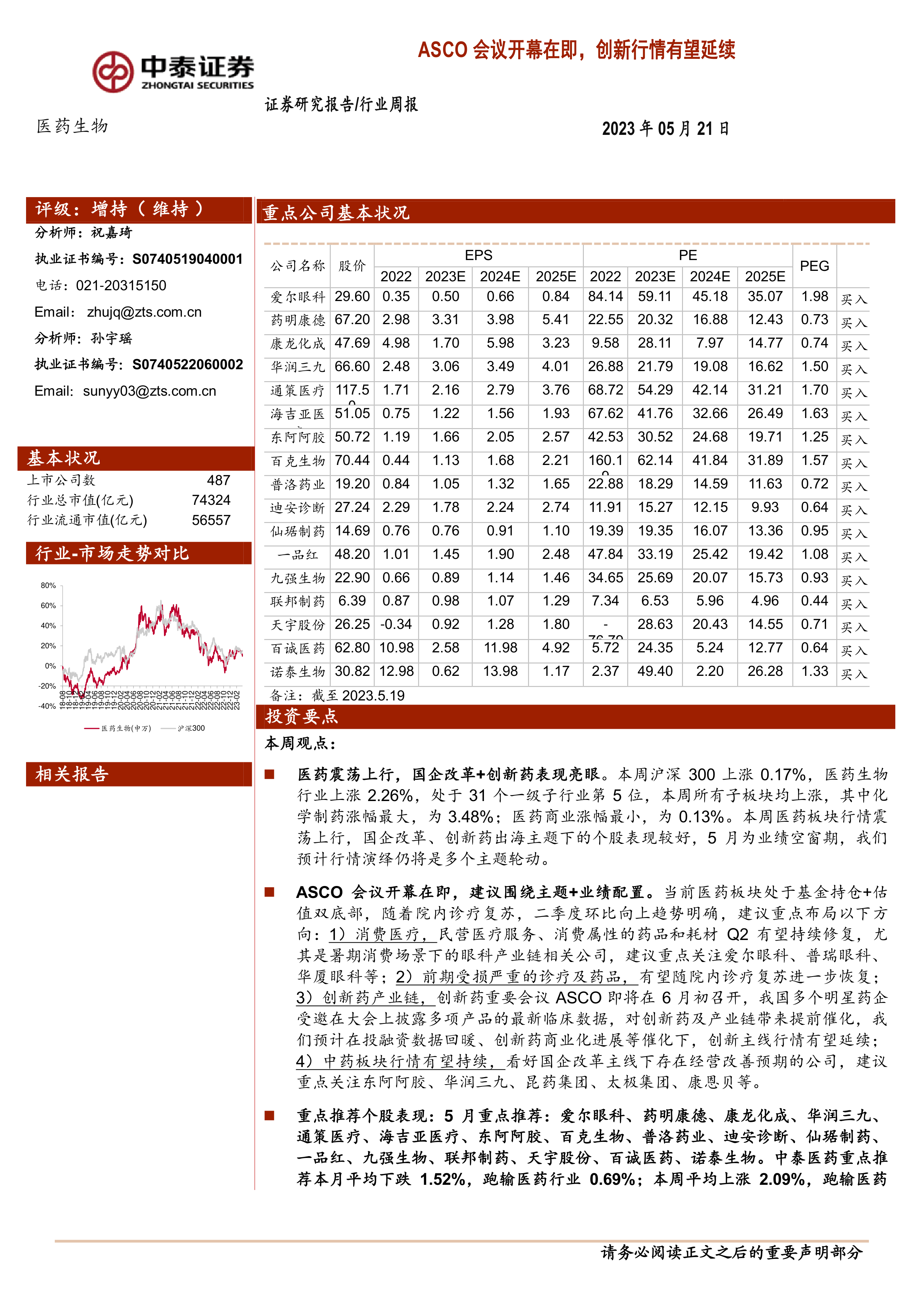 本报告的核心观点是:ASCO会议即将召开,将对创新药及产业链带来催化作用,医药板块行情有望延续。同时,报告建议投资者关注消费医疗、受损诊疗及药品板块的复苏,以及国企改革背景下中药板块的持续增长。 报告基于市场数据和公司基本面分析,对医药行业近期表现、估值水平以及未来走势进行了深入解读,并提供了具体的投资建议。