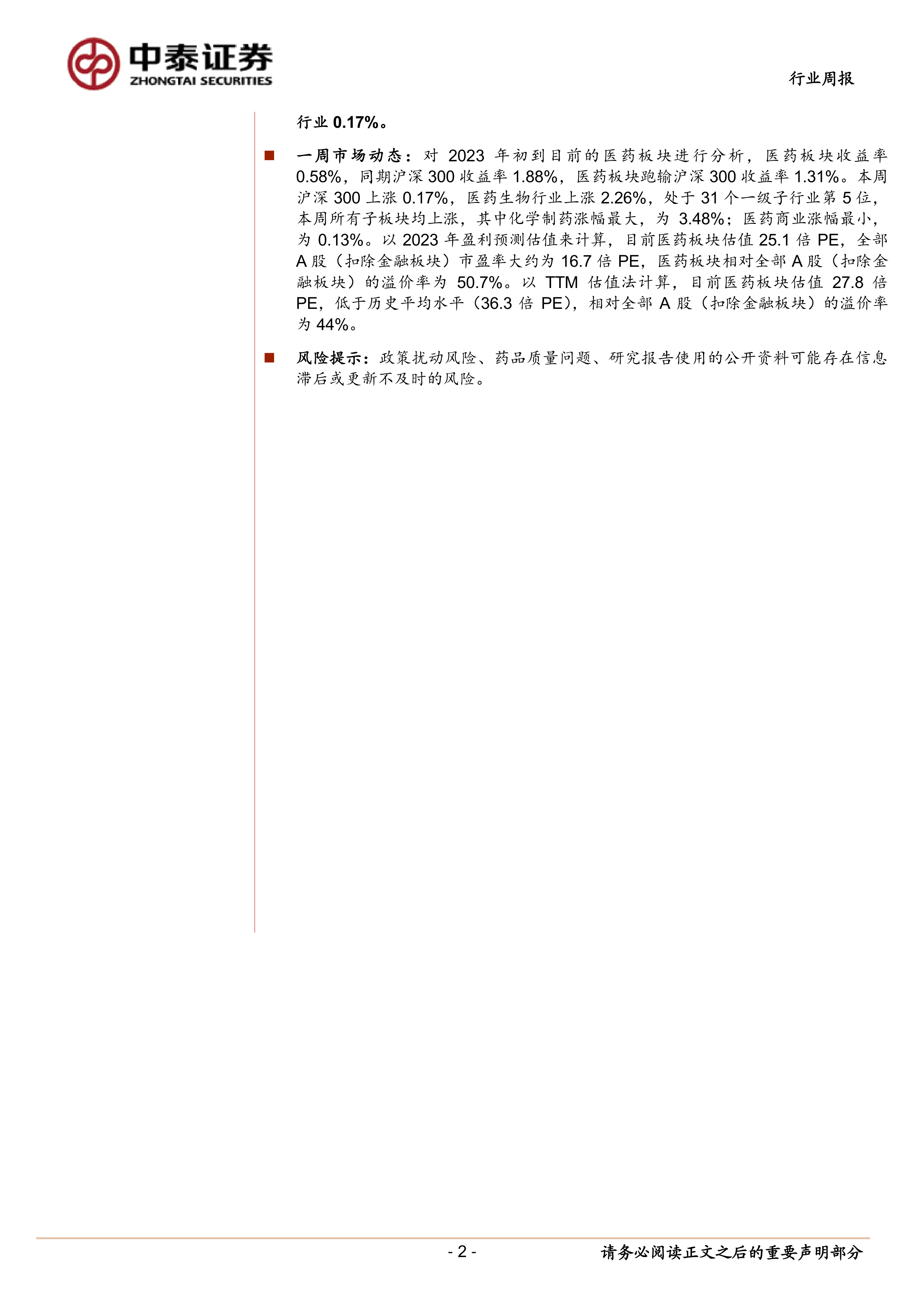 一周市场动态:对2023年初到目前的医药板块进行分析,医药板块收益率0.58%,同期沪深300收益率1.88%,医药板块跑输沪深300收益率1.31%。本周沪深300上涨0.17%,医药生物行业上涨2.26%,处于31个一级子行业第5位,本周所有子板块均上涨,其中化学制药涨幅最大,为3.48%;医药商业涨幅最小,为0.13%。以2023年盈利预测估值来计算,目前医药板块估值25.1倍PE,全部A股(扣除金融板块)市盈率大约为16.7倍PE,医药板块相对全部A股(扣除金融板块)的溢价率为50.7%。以TTM估值法计算,目前医药板块估值27.8倍PE,低于历史平均水平(36.3倍PE),相对全部A股(扣除金融板块)的溢价率为44%。