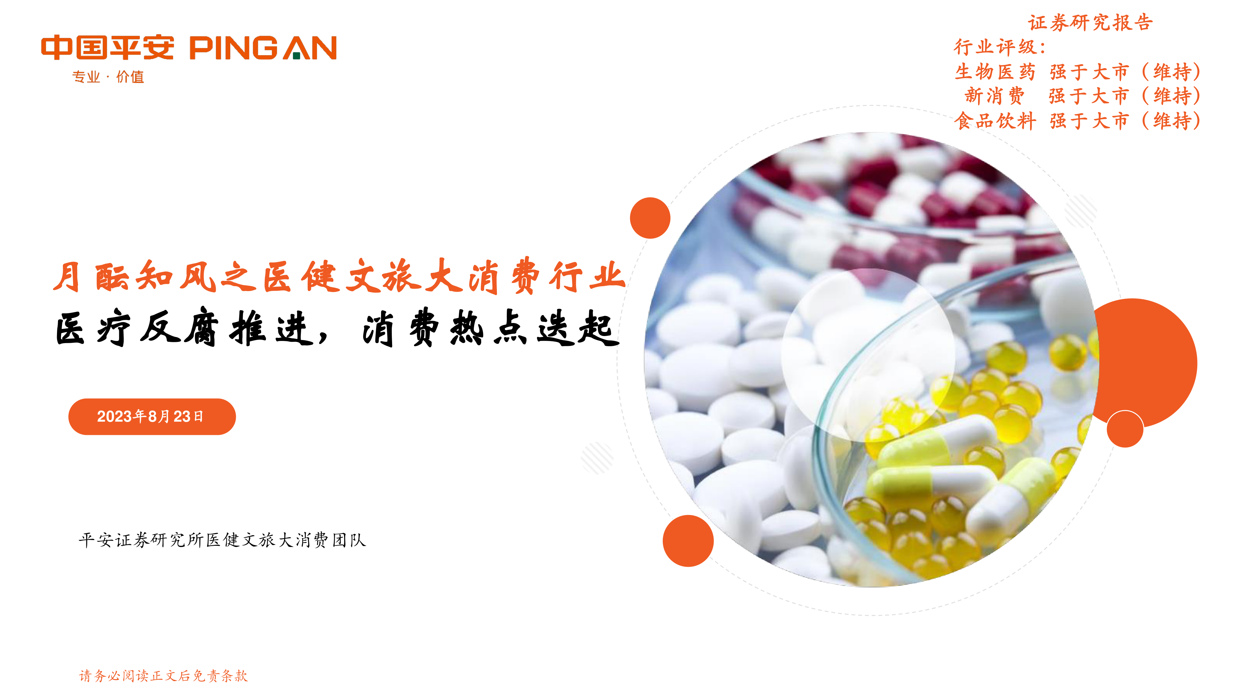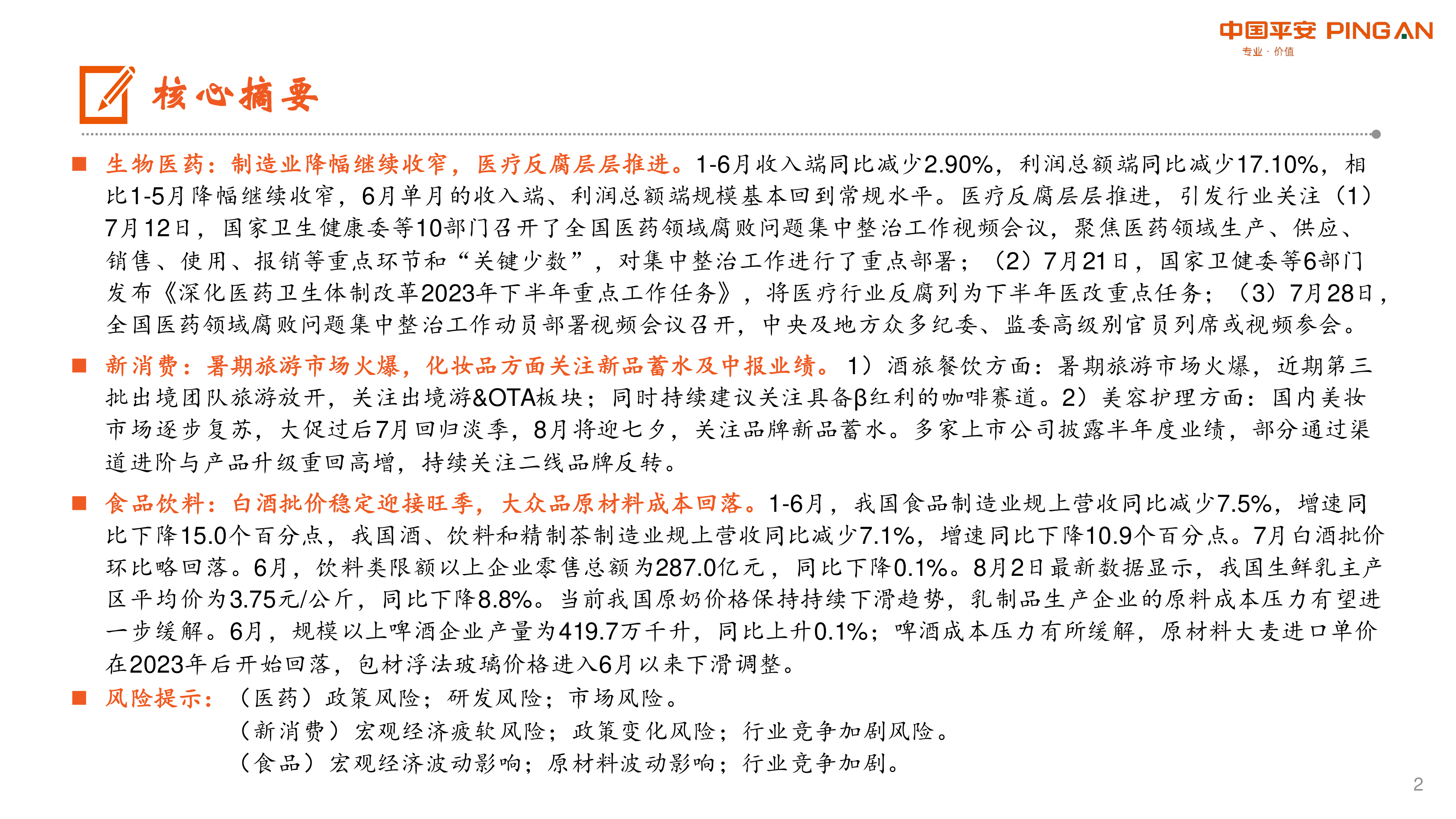 本报告的核心观点是:中国医健文旅大消费行业在2023年上半年经历了复杂的变化,医疗反腐的深入推进对生物医药行业造成冲击,但同时也促进了行业规范化发展;新消费领域,暑期旅游市场火爆,为酒旅餐饮和部分美容护理板块带来增长机遇;食品饮料行业则面临营收增速承压的挑战,但原材料成本回落为部分细分领域带来利好。总体而言,三个子行业都面临着机遇与挑战并存的局面,平安证券维持对生物医药、新消费和食品饮料行业的“强于大市”评级。