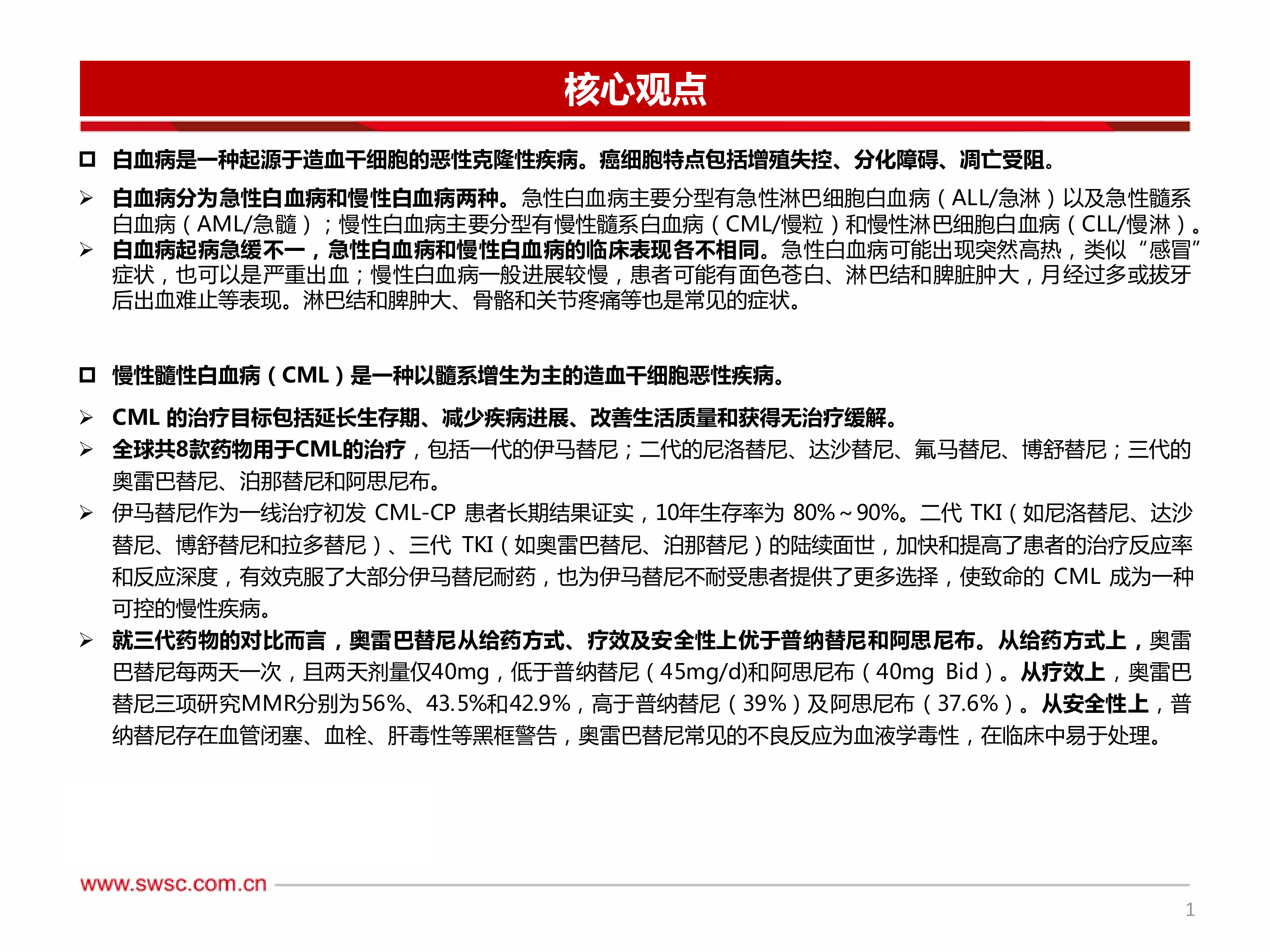 本报告的核心观点是:髓系白血病(包括慢性髓系白血病CML和急性髓系白血病AML)的治疗正经历着革命性的变化,Bcl-2抑制剂和三代BCR-ABL激酶抑制剂的出现显著改善了患者的预后。报告通过对CML和AML的疾病特征、治疗现状及相关药物的分析,阐述了这些新药的临床意义和市场前景,并指出了创新药研发及市场推广中存在的风险。