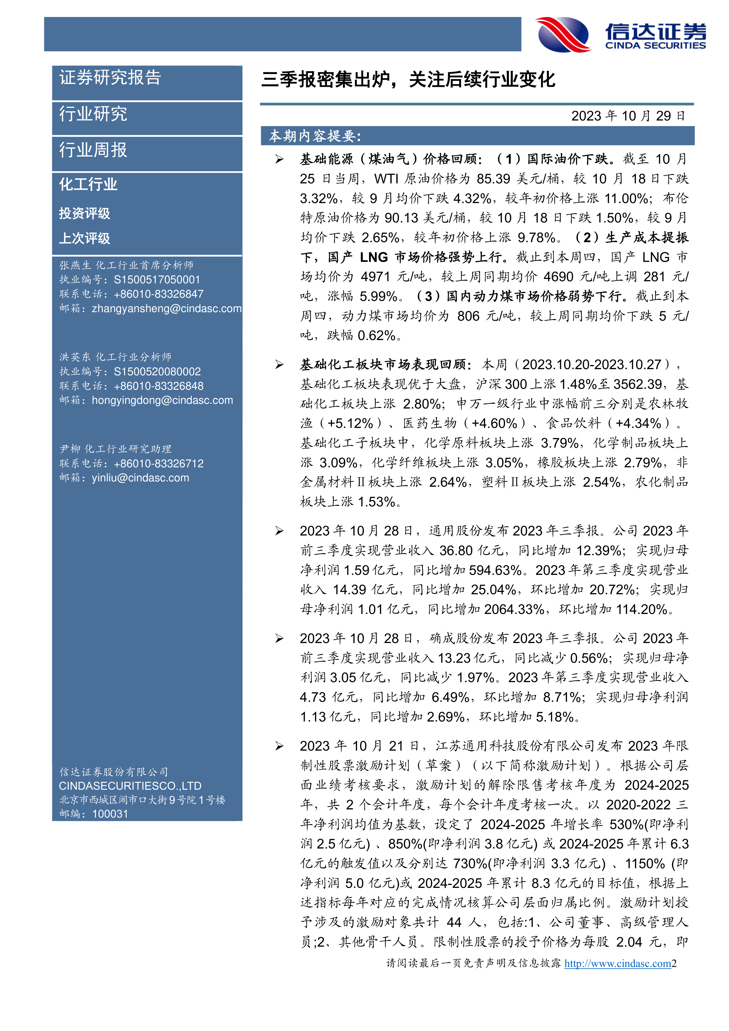 本报告的核心观点是:化工行业三季度报密集发布,基础化工板块表现优于大盘,部分子板块涨幅显著。国际油价波动、国内能源价格调整以及宏观经济环境对化工行业产生影响。重点关注赛轮轮胎、确成股份、通用股份等公司的业绩表现及发展战略。报告同时分析了轮胎、农化、煤化工和精细化工等重点行业及子行业的市场行情,并指出了行业面临的风险因素。