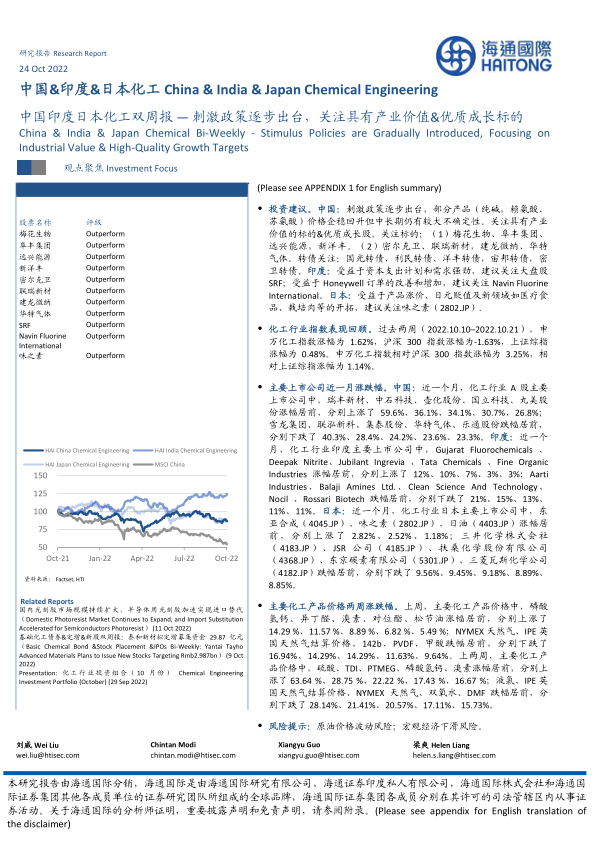 本报告的核心观点是:中国、印度和日本化工行业在2022年10月面临着复杂且多变的市场环境。中国化工行业受到刺激政策的影响,部分产品价格企稳回升,但中长期仍存在不确定性;印度化工行业受益于资本支出计划和强劲的需求;日本化工行业则受益于产品涨价、日元贬值和新兴领域的拓展。报告建议关注具有产业价值和优质成长潜力的化工企业,并对中印日三国部分重点化工企业和产品进行了投资建议和市场分析。