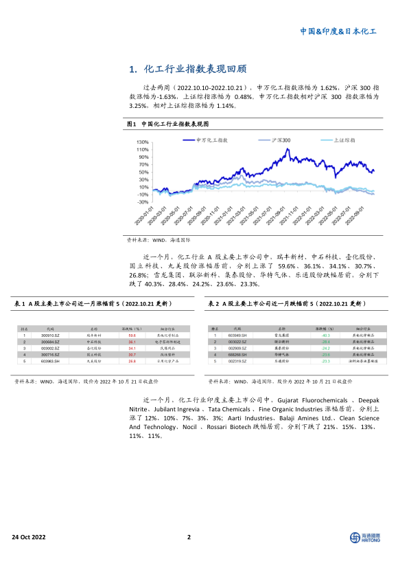 过去两周,申万化工指数涨幅为1.62%,跑赢同期沪深300指数(-1.63%)和上证综指(0.48%)。近一个月,中国化工行业A股主要上市公司涨跌幅分化明显,瑞丰新材、中石科技等涨幅居前,而雪龙集团、联泓新科等跌幅居前。印度化工行业主要上市公司中,Gujarat Fluorochemicals和Deepak Nitrite等涨幅居前,Aarti Industries和Balaji Amines Ltd.等跌幅居前。日本化工行业主要上市公司中,东亚合成和味之素等涨幅居前,三井化学和JSR公司等跌幅居前。这些数据反映出中印日三国化工行业市场表现的差异和波动性。
