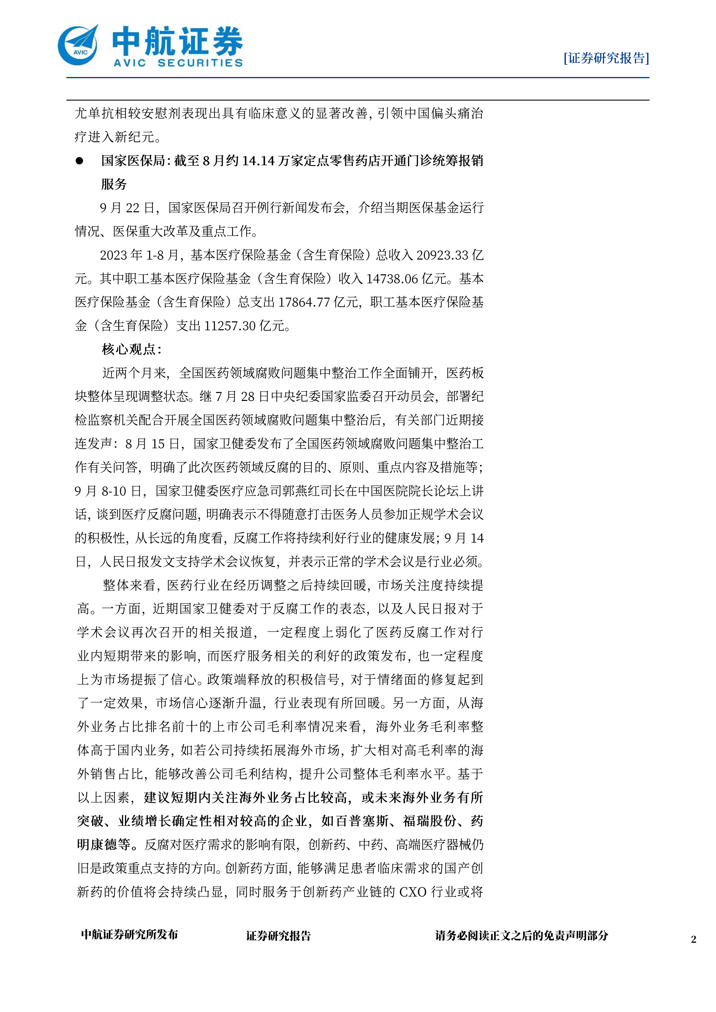 近两个月来,全国医药领域腐败问题集中整治工作全面铺开,医药板块整体呈现调整状态。继7月28日中央纪委国家监委召开动员会,部署纪检监察机关配合开展全国医药领域腐败问题集中整治后,有关部门近期接连发声:8月15日,国家卫健委发布了全国医药领域腐败问题集中整治工作有关问答,明确了此次医药领域反腐的目的、原则、重点内容及措施等9月8-10日,国家卫健委医疗应急司郭燕红司长在中国医院院长论坛上讲话,谈到医疗反腐问题,明确表示不得随意打击医务人员参加正规学术会议的积极性,从长远的角度看,反腐工作将持续利好行业的健康发展;9月14日,人民日报发文支持学术会议恢复,并表示正常的学术会议是行业必须。