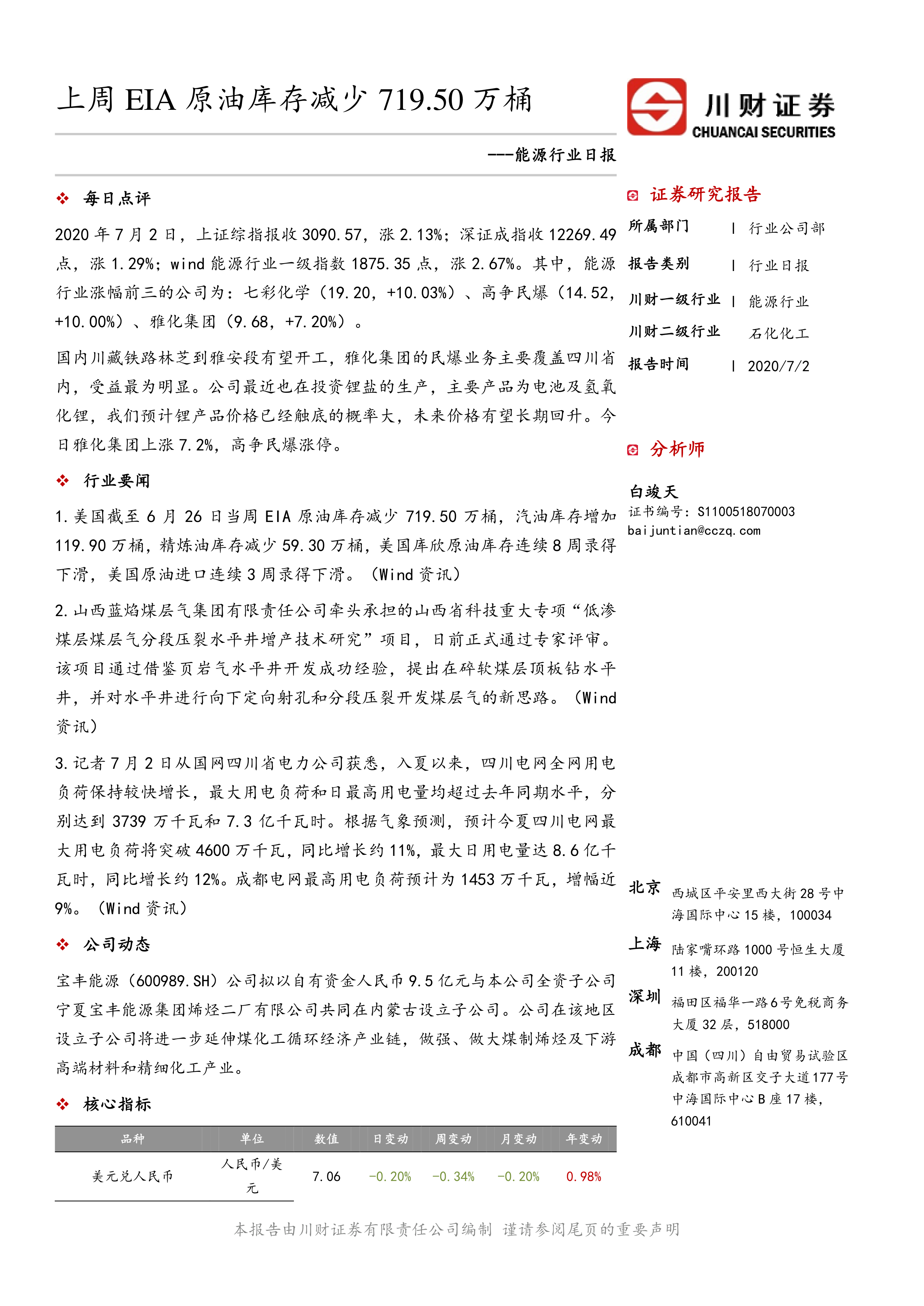 本报告通过对美国原油库存数据、国内能源行业政策及公司动态的分析,以及对相关能源产品价格走势的跟踪,全面反映了2020年7月2日能源行业的市场状况。美国原油库存的下降对油价形成支撑,而国内能源行业在政策支持和技术进步的推动下,也呈现出积极的发展态势。部分能源公司,例如雅化集团和宝丰能源,由于利好消息和业务发展,股价出现显著上涨。 然而,报告也提示了国际成品油需求大幅下滑和电力需求不及预期的风险。 投资者需谨慎参考报告内容,并结合自身情况进行投资决策。 报告中提供的价格和数据仅供参考,不构成投资建议。