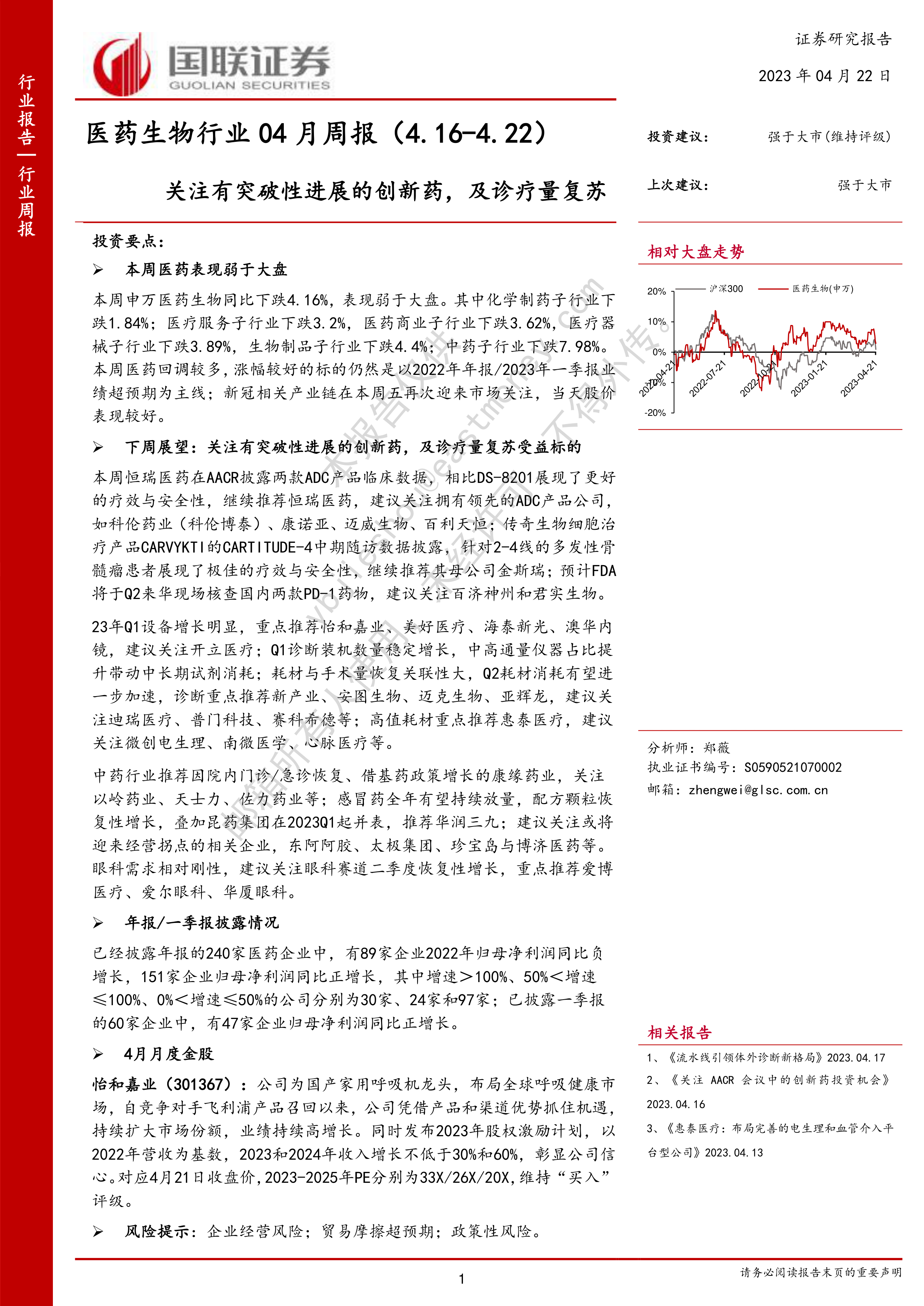 本周医药生物行业整体表现弱于大盘,回调明显。涨幅较好的个股主要集中在2022年年报或2023年一季报业绩超预期的公司。新冠相关产业链在周五受到市场关注,个股表现较好,这与张文宏教授关于新冠二次感染的言论有关。下周投资策略建议关注:1)具有突破性进展的创新药,例如ADC药物、CAR-T细胞疗法和PD-1药物;2)受益于诊疗量复苏的医疗器械和医疗服务板块;3)业绩增长潜力较大的中药企业。