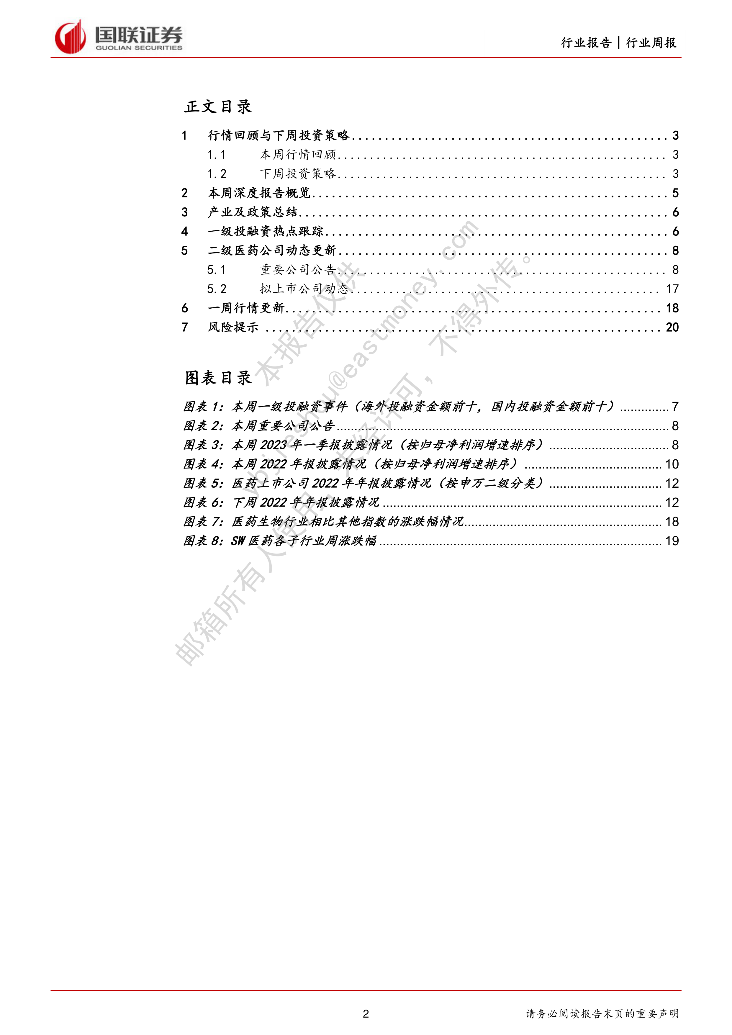 本周多家医药公司发布公告,包括股东减持、定增预案、研发进展等信息,例如药明康德股东减持、恒瑞医药研发进展等。 部分公司披露了2023年一季报和2022年年报数据,数据显示业绩分化明显,部分公司业绩增长强劲,部分公司业绩下滑。