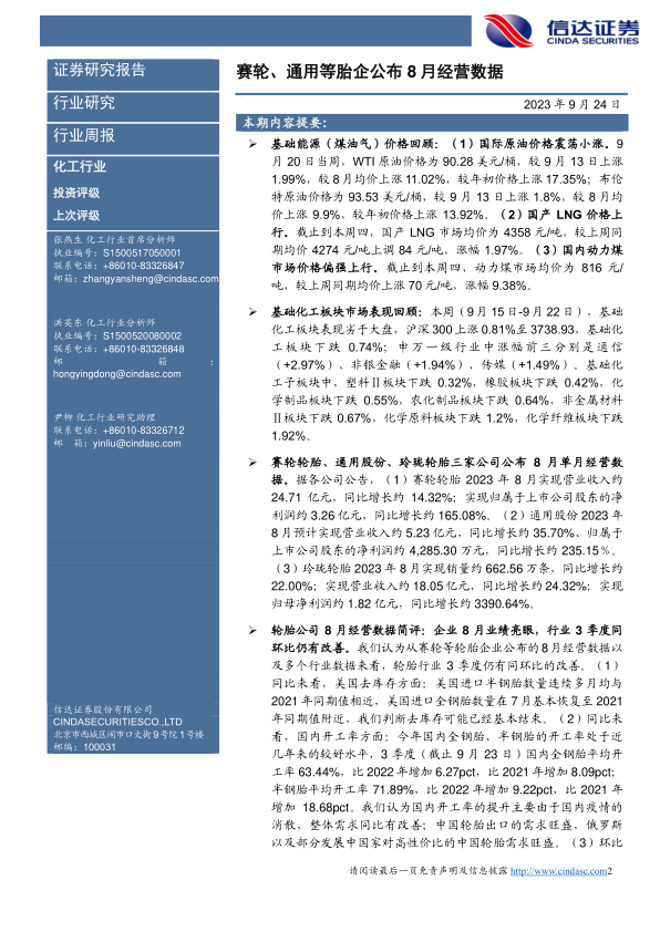 本报告的核心观点是:中国轮胎行业三季度表现向好,主要体现在同比和环比两个方面。同比来看,美国轮胎市场去库存基本结束,国内轮胎开工率处于近几年高位,出口需求旺盛;环比来看,美国去库存影响减弱,原材料价格上涨受到轮胎涨价的抵消。赛轮轮胎、通用股份和玲珑轮胎8月经营数据亮眼,体现了行业整体向好趋势。 同时,报告也分析了基础能源价格(原油、LNG、动力煤)以及基础化工板块、农化行业、煤化工行业、精细化工行业和新能源上游产品(纯碱、EVA、POE)的市场表现,并对重点标的赛轮轮胎、确成股份、通用股份进行了简要分析。