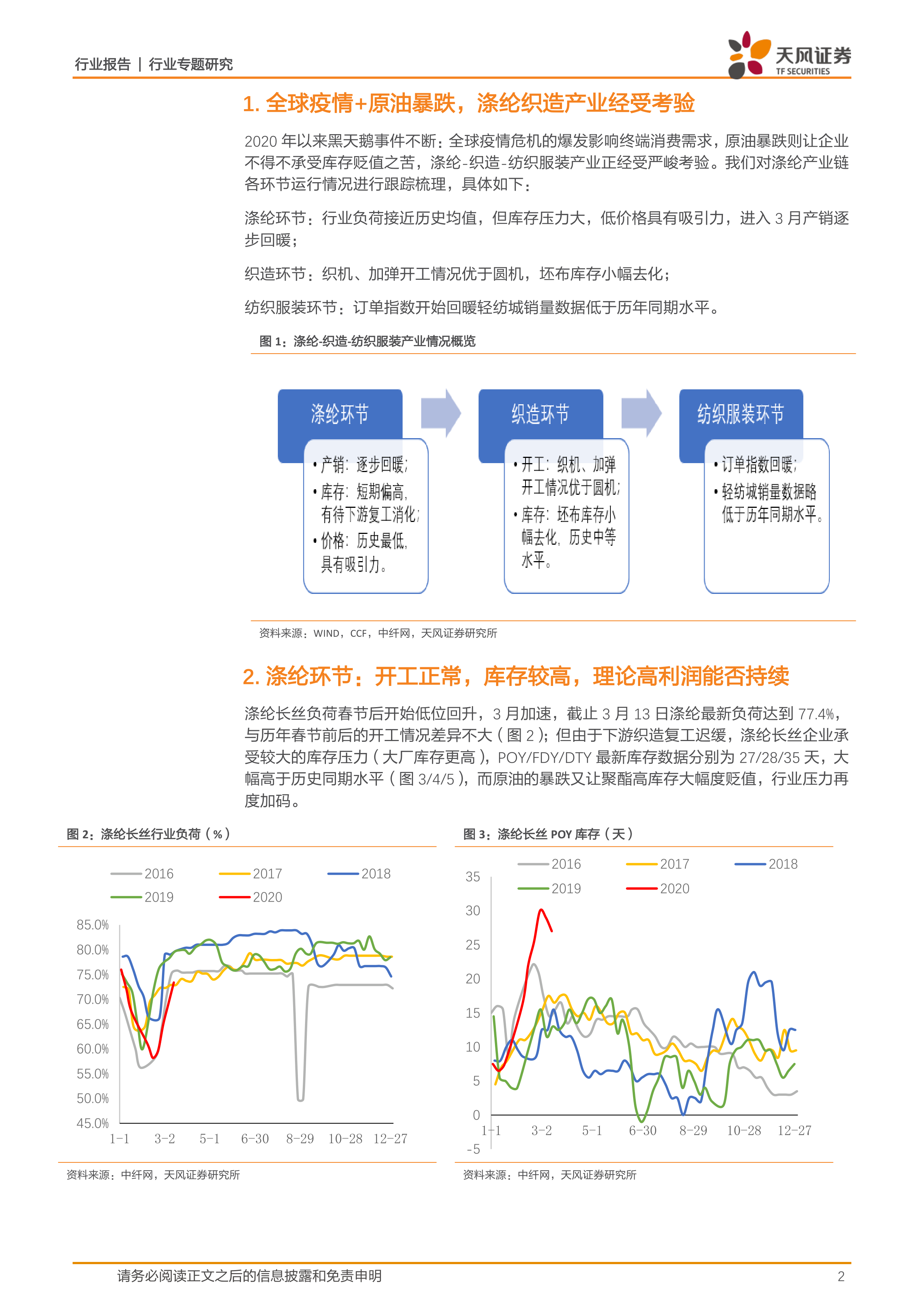 本报告的核心观点是:2020年以来,全球疫情和原油暴跌对涤纶织造产业链造成了严重冲击。虽然涤纶长丝环节理论上利润可观,但高库存压力和下游复工迟缓限制了其盈利能力的释放。织造环节复工进度缓慢,库存有所下降,但整体开工率低于往年水平。纺织服装环节订单虽有回暖迹象,但轻纺城成交量仍低于往年同期。因此,涤纶织造产业链面临着严峻的考验,未来发展仍存在诸多不确定性。