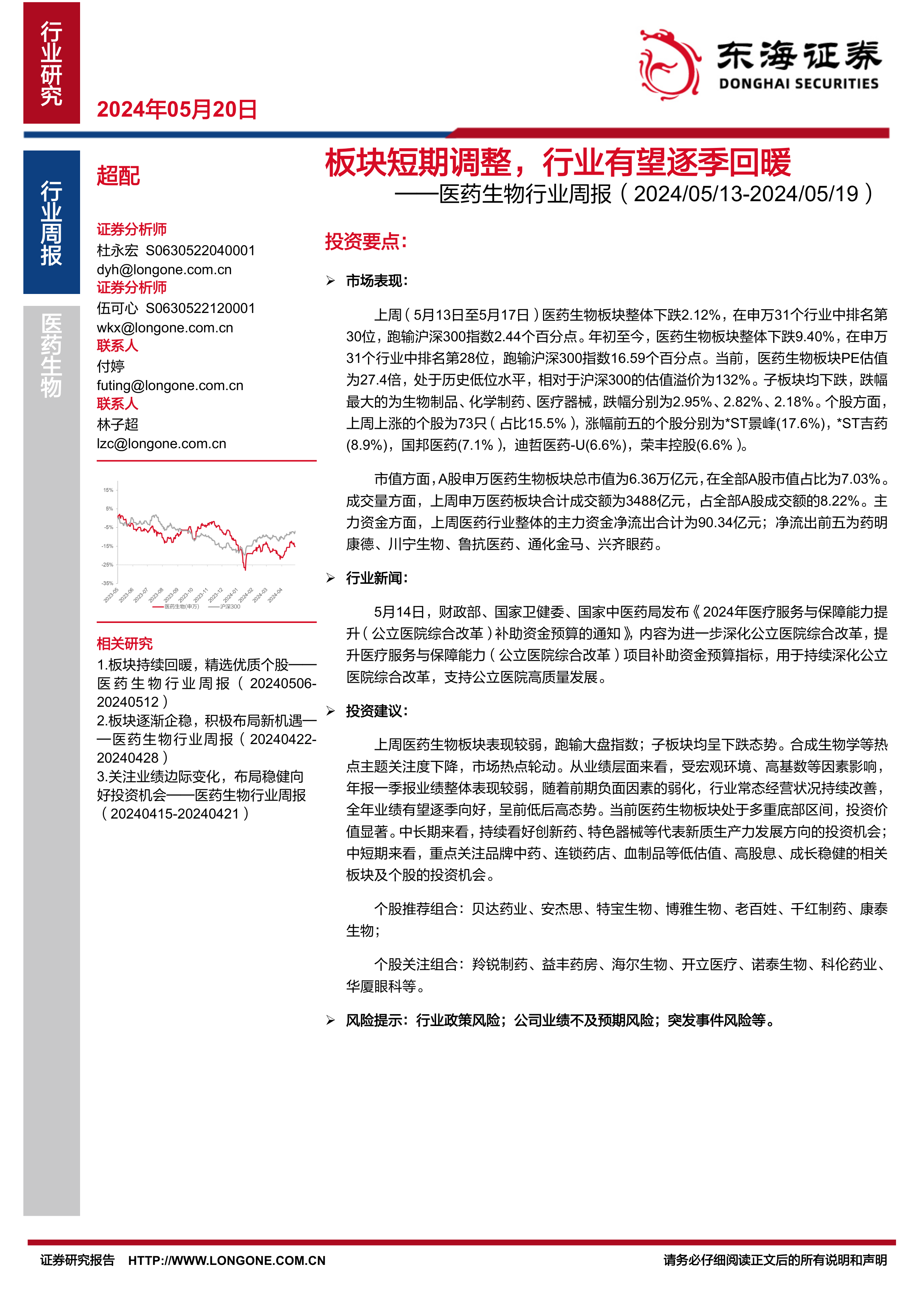 个股关注组合:羚锐制药、益丰药房、海尔生物、开立医疗、诺泰生物、科伦药业、华厦眼科等。