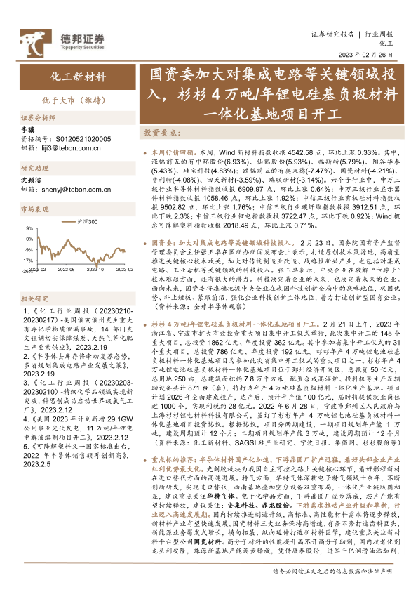 化工新材料行业周报:国资委加大对集成电路等关键领域投入,杉杉4万吨/年锂电硅基负极材料一体化基地项目开工