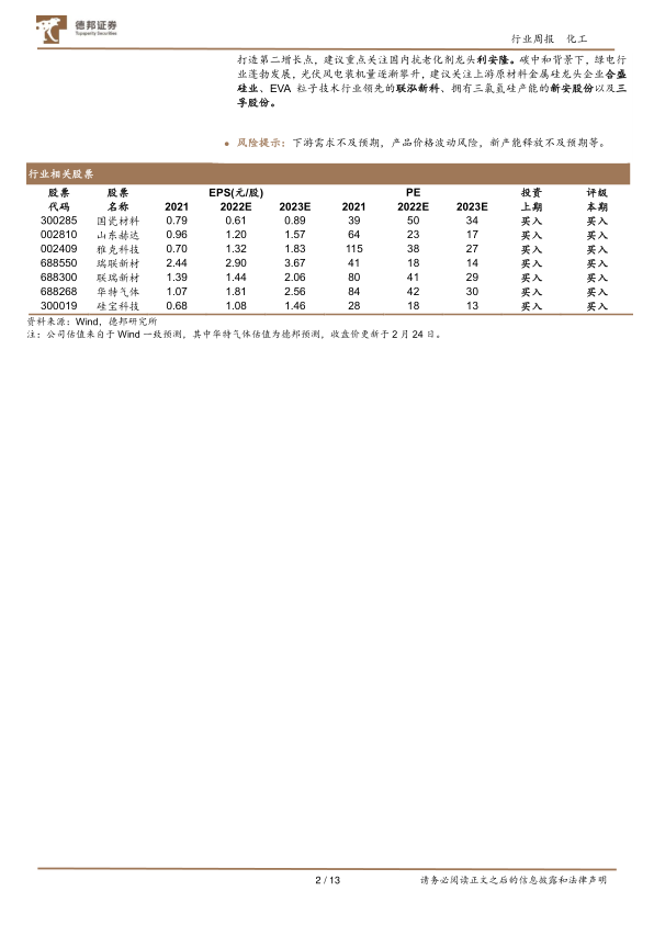 重点标的推荐:半导体材料国产化加速,下游晶圆厂扩产迅猛,看好头部企业产业红利优势最大化。 光刻胶板块为我国自主可控之路上关键核心环节,看好彤程新材在进口替代方面的高速进展。特气方面, 华特气体深耕电子特气领域十余年,不断创新研发,实现进口替代,西南基地叠加空分设备双重布局,一体化产业链版图初显,建议重点关注华特气体。电子化学品方面,下游晶圆厂逐步落成,芯片产能有望持续释放,建议关注: 安集科技、鼎龙股份。 下游需求推动产业升级和革新,行业迈入高速发展期。 国内持续推进制造升级,高标准、高性能材料需求将逐步释放,新材料产业有望快速发展。国瓷材料三大业务保持高增速,有条不紊打造齿科巨头,新能源业务爆发式增长,横向拓展、纵向延伸打造新材料巨擘,建议重点关注新材料平台型公司国瓷材料。高分子材料的性能提升离不开高分子助剂,国内抗老化剂龙头利安隆,珠海新基地产能逐步释放,凭借康泰股份,进军千亿润滑油添加剂,打造第二增长点,建议重点关注国内抗老化剂龙头利安隆。 碳中和背景下,绿电行业蓬勃发展,光伏风电装机量逐渐攀升,建议关注上游原材料金属硅龙头企业合盛硅业、 EVA 粒子技术行业领先的联泓新科、拥有三氯氢硅产能的新安股份以及三孚股份。