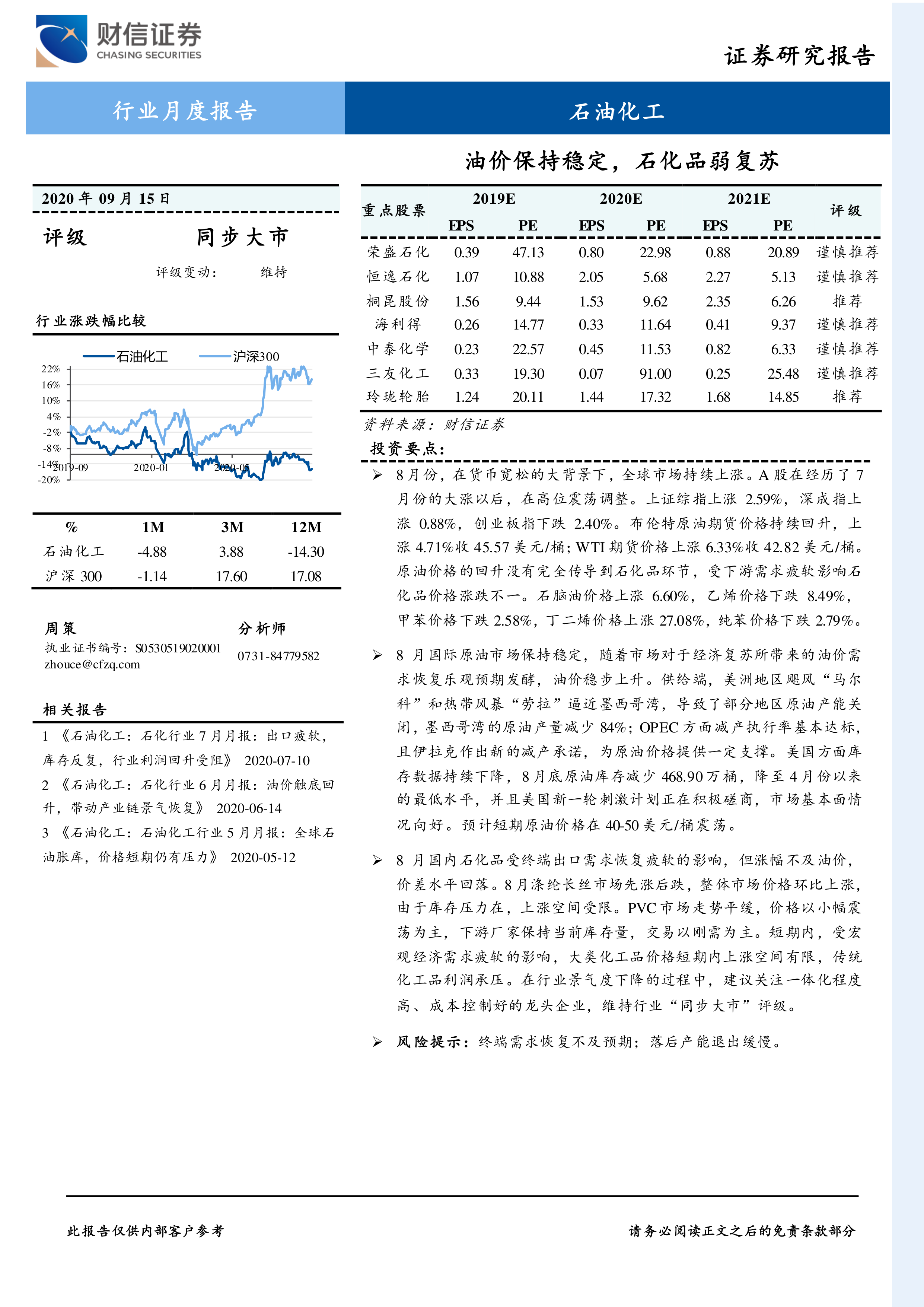 本报告详细分析了2020年8月石油化工行业的市场行情,并对重点股票进行了评级。报告内容涵盖了板块行情回顾、市场行情数据、行业重要事件和公告、行业产品价格跟踪以及行业核心观点等方面。