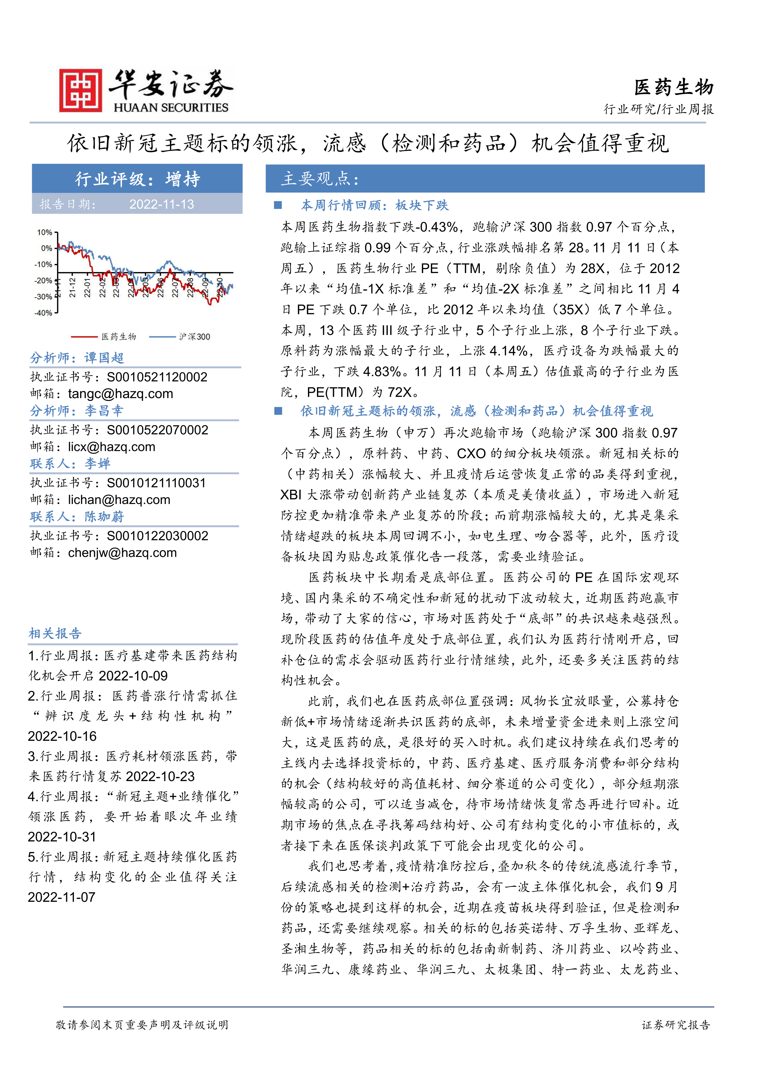 本报告对2022年11月13日一周的医药生物行业进行了全面分析。报告指出,尽管行业整体表现弱于市场,但估值已处于底部区域,部分细分领域,特别是新冠相关标的和流感相关标的,展现出增长潜力。 报告建议投资者关注结构性机会,并根据自身风险承受能力,谨慎选择投资标的,长期看好医药行业发展。 报告提供了详细的投资建议和具体的公司标的,为投资者提供了有价值的参考信息。 然而,报告也提示了政策风险、竞争风险和股价异常波动风险,投资者需谨慎决策。