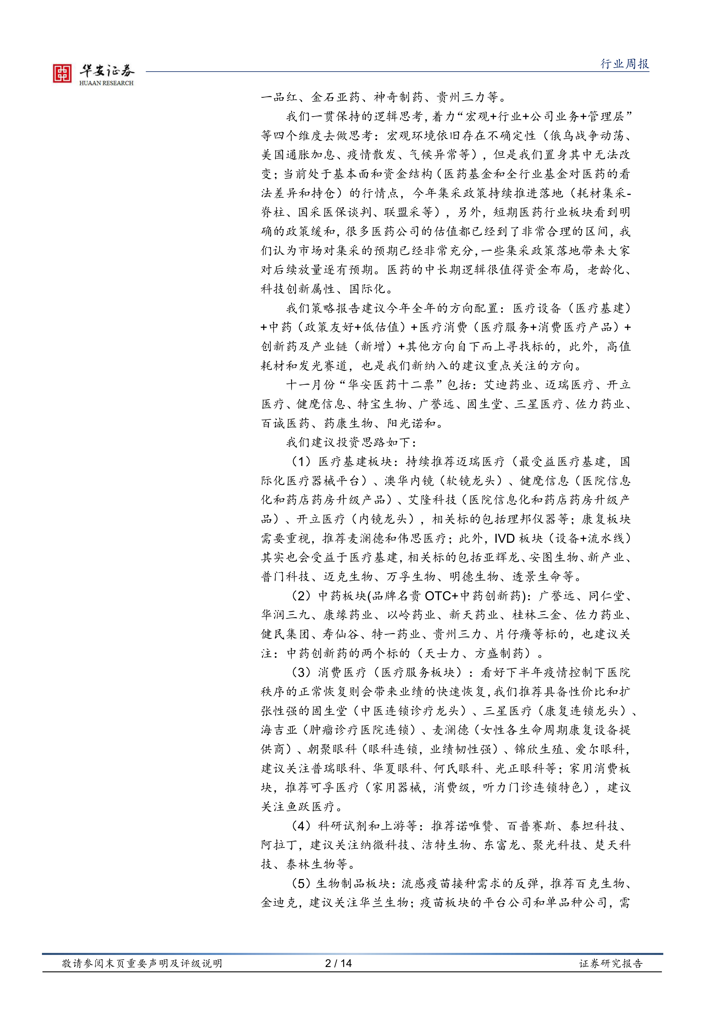 报告详细阐述了投资策略,包括对医疗基建、中药、医疗服务消费、创新药及产业链、高值耗材和发光赛道等多个细分领域的投资建议,并推荐了具体的公司标的。 报告还列出了“华安医药十二票”,即华安证券推荐的12只医药股票。
