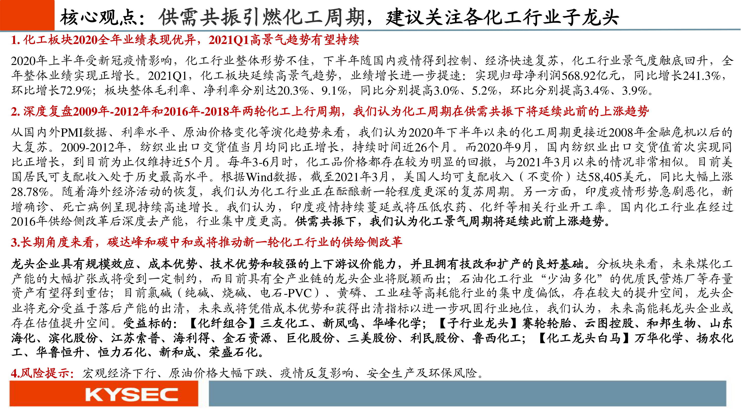 本报告的核心观点是:供需共振引燃化工周期,预计将延续此前上涨趋势,但需关注潜在风险。报告基于2020年全年及2021年Q1化工板块业绩的优异表现,结合对2009-2012年和2016-2018年两轮化工上行周期的深度复盘,以及对宏观经济形势、国际油价、疫情发展和碳中和政策等因素的分析,得出这一结论。报告建议关注化工行业子行业龙头企业,并列出了具体的受益标的。同时,报告也指出了宏观经济下行、原油价格大幅下跌、疫情反复影响以及安全生产及环保风险等潜在风险。