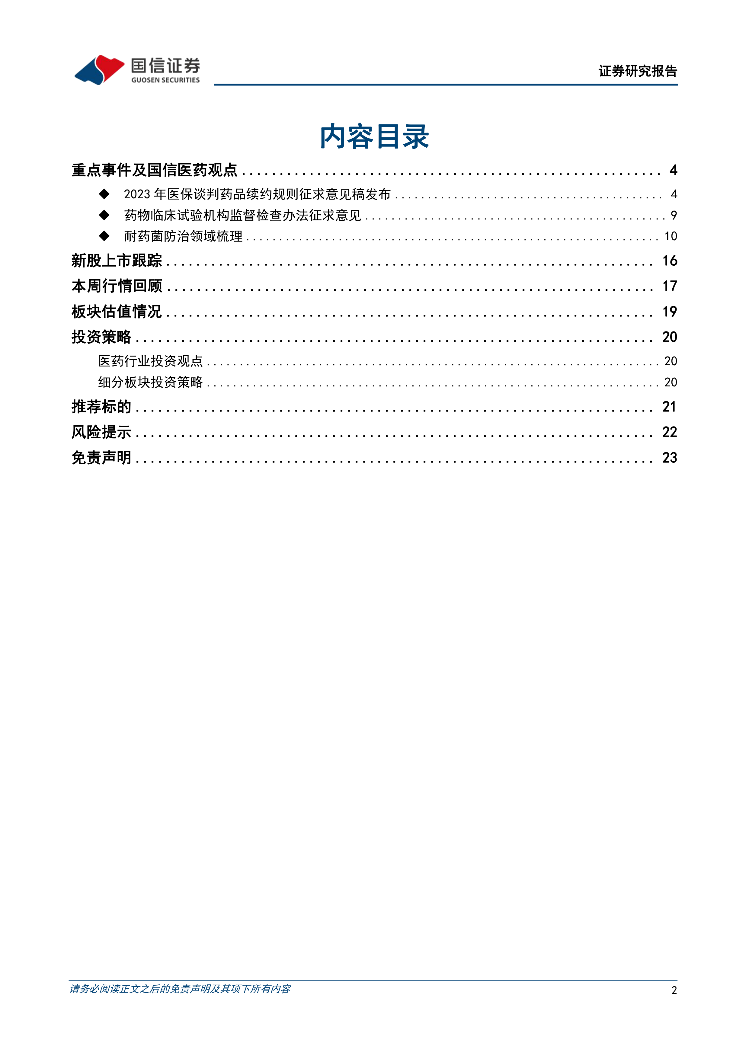 风险提示:疫情反复的风险、创新药研发失败风险、药耗集采风险。