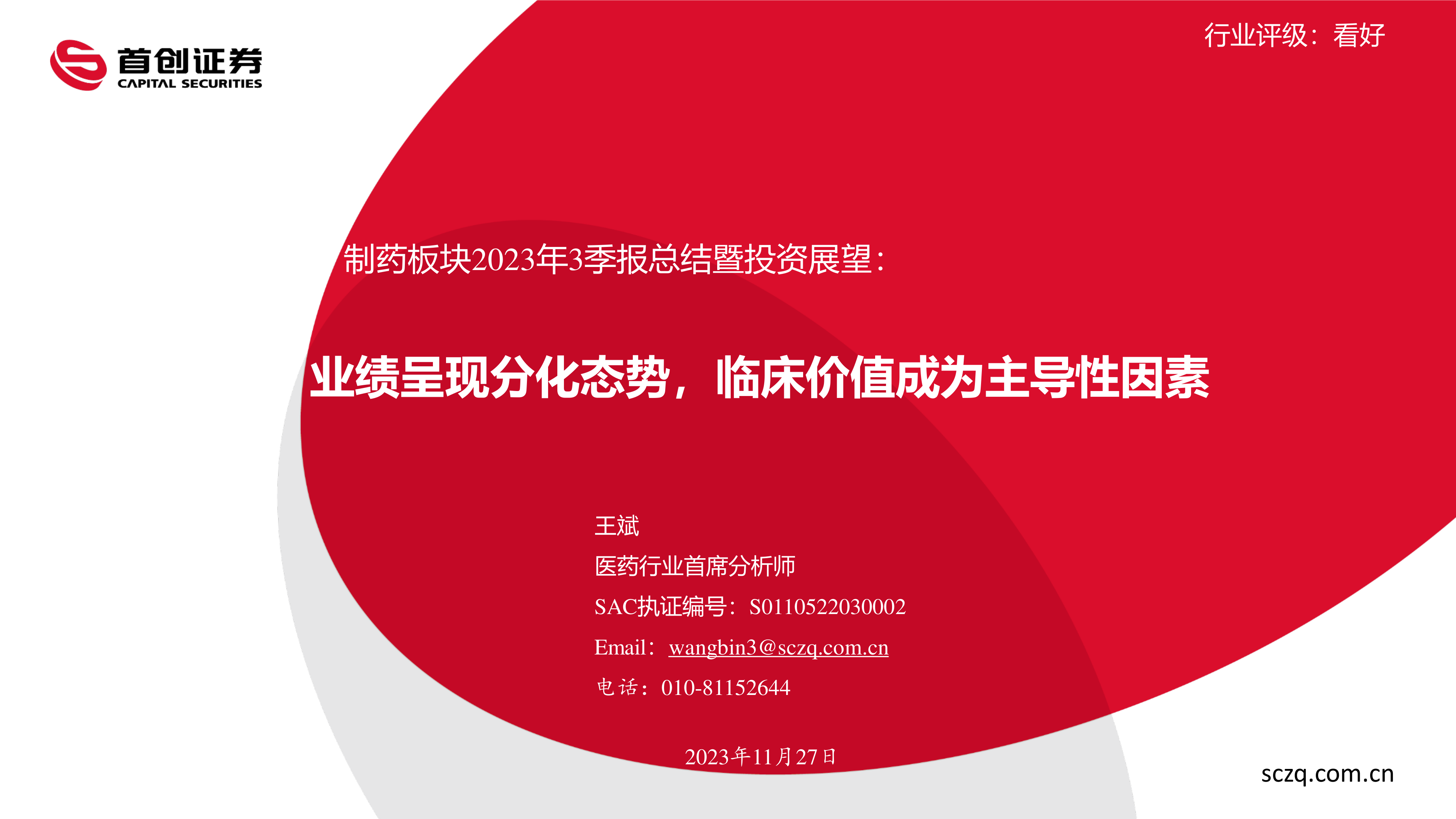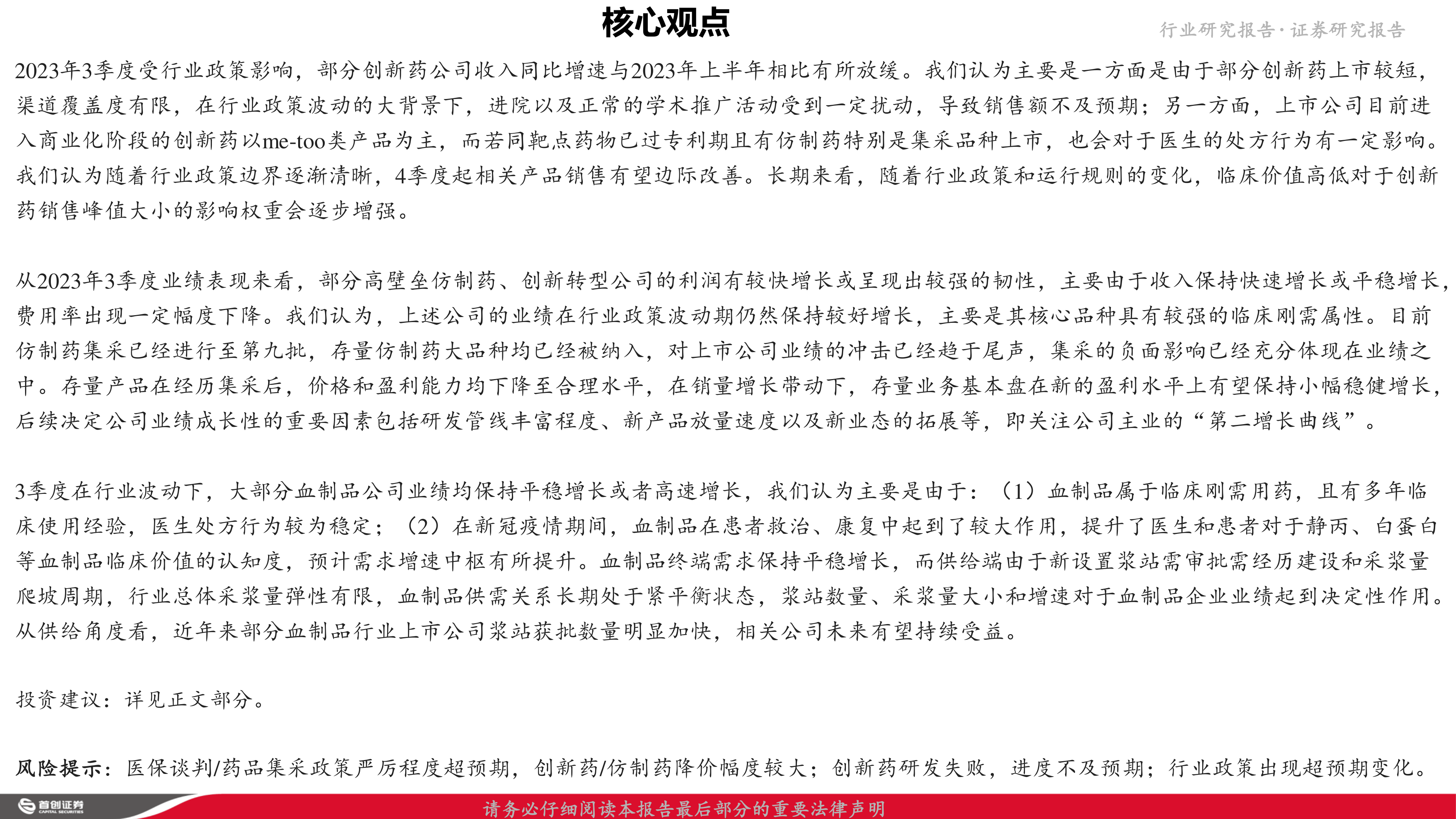 制药板块2023年3季报总结暨投资展望:业绩呈现分化态势,临床价值成为主导性因素