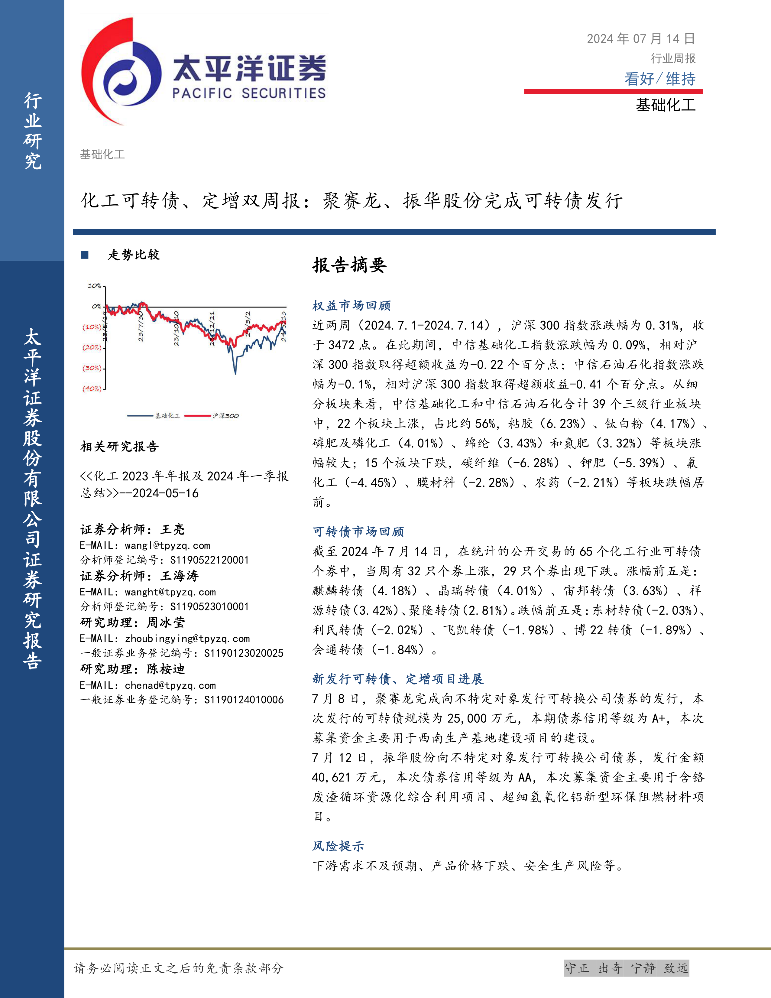 本报告对2024年7月1日至14日基础化工行业及可转债市场进行了数据驱动分析。 结果显示,基础化工行业市场表现分化,部分细分领域表现强劲,而可转债市场波动较大。 聚赛龙和振华股份完成可转债发行,以及其他企业积极进行定增融资,表明化工企业融资活动活跃,并积极布局新能源、环保等领域。 投资者需关注下游需求变化、产品价格波动以及安全生产风险等因素。 报告中提供的数据和信息仅供参考,不构成投资建议。