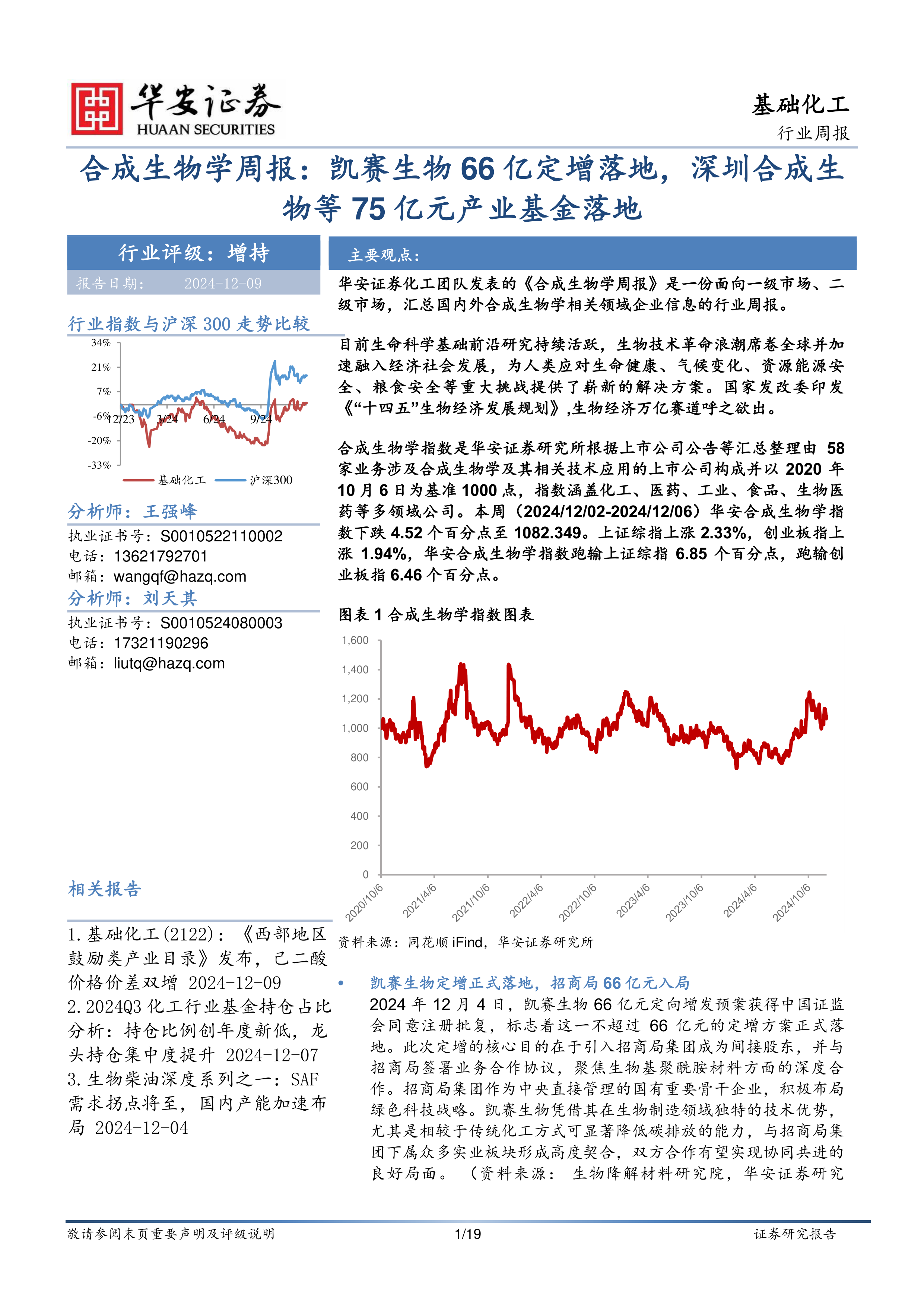 合成生物学指数是华安证券研究所根据上市公司公告等汇总整理由58家业务涉及合成生物学及其相关技术应用的上市公司构成并以2020年10月6日为基准1000点,指数涵盖化工、医药、工业、食品、生物医药等多领域公司。本周(2024/12/02-2024/12/06)华安合成生物学指数下跌4.52个百分点至1082.349。上证综指上涨2.33%,创业板指上涨1.94%,华安合成生物学指数跑输上证综指6.85个百分点,跑输创业板指6.46个百分点。