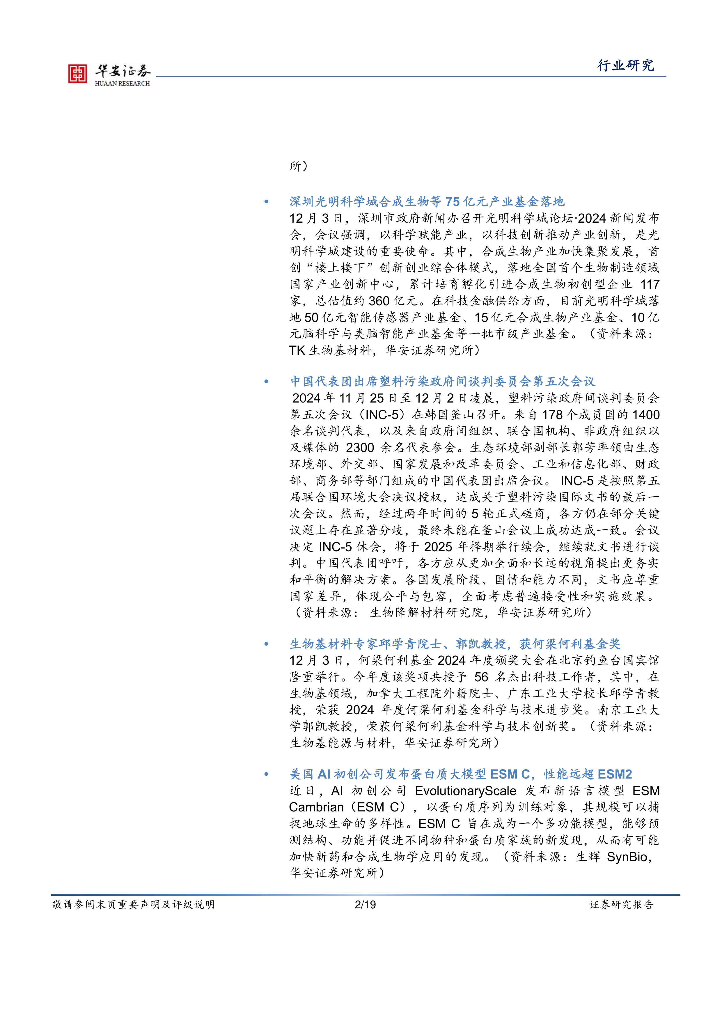 12月3日,深圳市政府新闻办召开光明科学城论坛·2024新闻发布会,会议强调,以科学赋能产业,以科技创新推动产业创新,是光明科学城建设的重要使命。其中,合成生物产业加快集聚发展,首创“楼上楼下”创新创业综合体模式,落地全国首个生物制造领域国家产业创新中心,累计培育孵化引进合成生物初创型企业117家,总估值约360亿元。在科技金融供给方面,目前光明科学城落地50亿元智能传感器产业基金、15亿元合成生物产业基金、10亿元脑科学与类脑智能产业基金等一批市级产业基金。(资料来源:TK生物基材料,华安证券研究所)