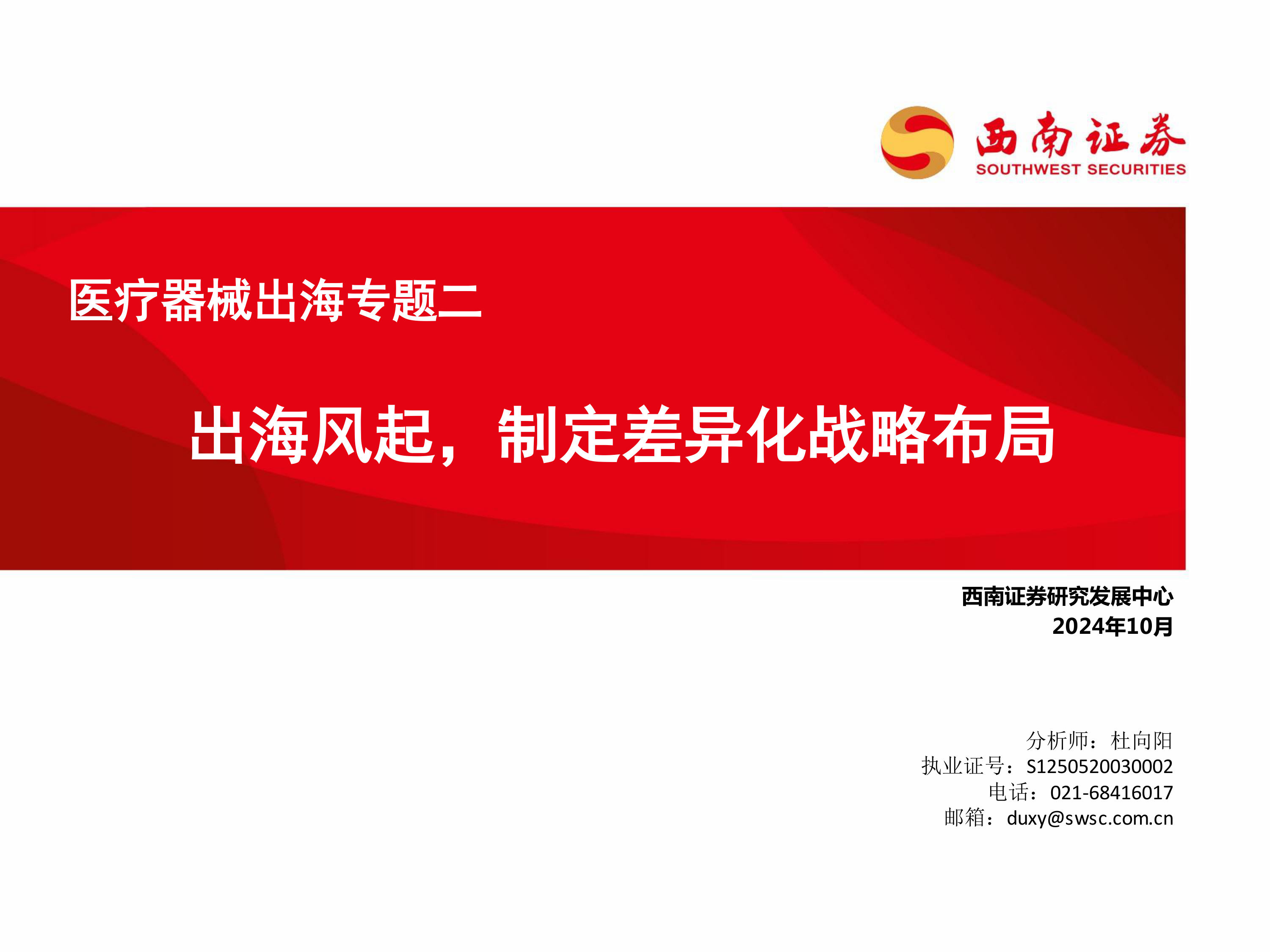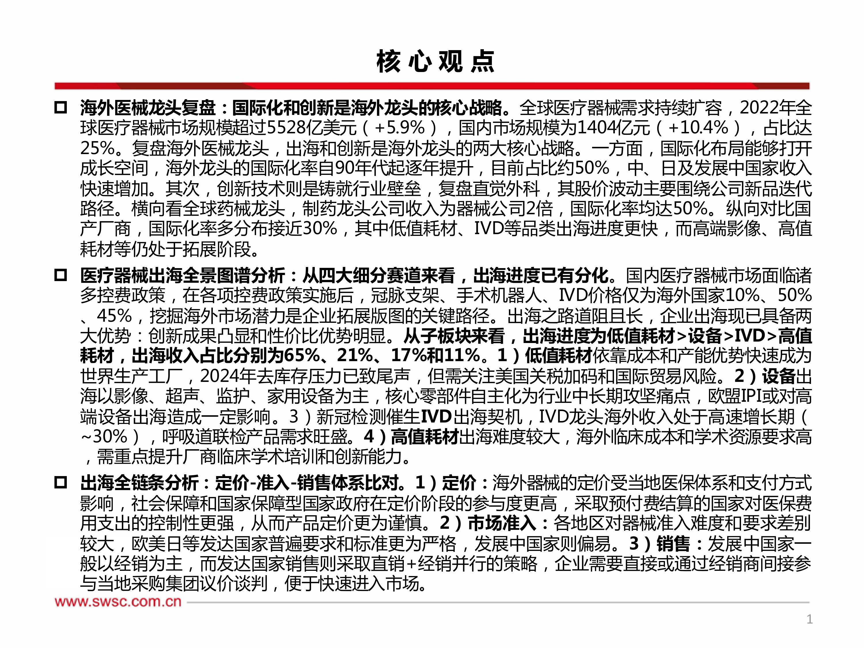本报告的核心观点是:中国医疗器械企业出海面临机遇与挑战并存的局面。机遇在于全球医疗器械市场持续扩容,国内企业在创新能力和性价比方面具备优势;挑战在于国际化率相对较低,不同细分赛道出海进度分化明显,以及面临专利诉讼、汇率、地缘政治等风险。报告建议企业制定差异化战略布局,根据不同市场特点选择合适的出海路径,并提升创新能力和临床学术水平。