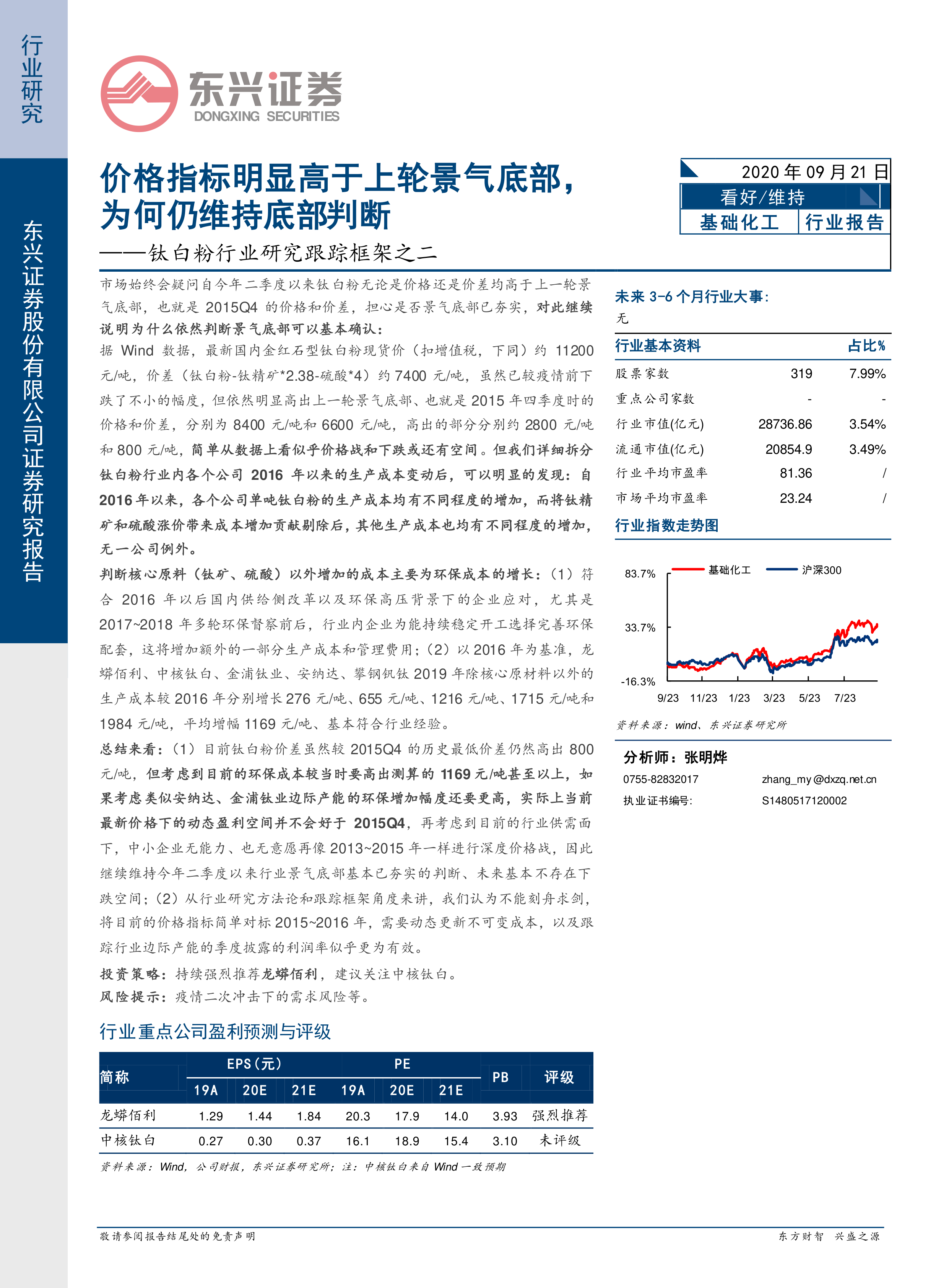 本报告通过对钛白粉价格、价差以及生产成本(特别是环保成本)的深入分析,得出结论:尽管当前钛白粉价格高于上一轮景气底部,但考虑到环保成本的显著增加以及中小企业无力且不愿再次发起价格战,行业景气底部已基本夯实,未来价格下跌空间有限。 报告强调了动态成本分析的重要性,并对龙蟒佰利和中核钛白提出了投资建议,同时指出了疫情带来的潜在风险。 报告的研究方法论强调了动态更新不可变成本,以及跟踪行业边际产能季度利润率的重要性,避免了简单地将当前市场指标与历史数据进行静态比较。
