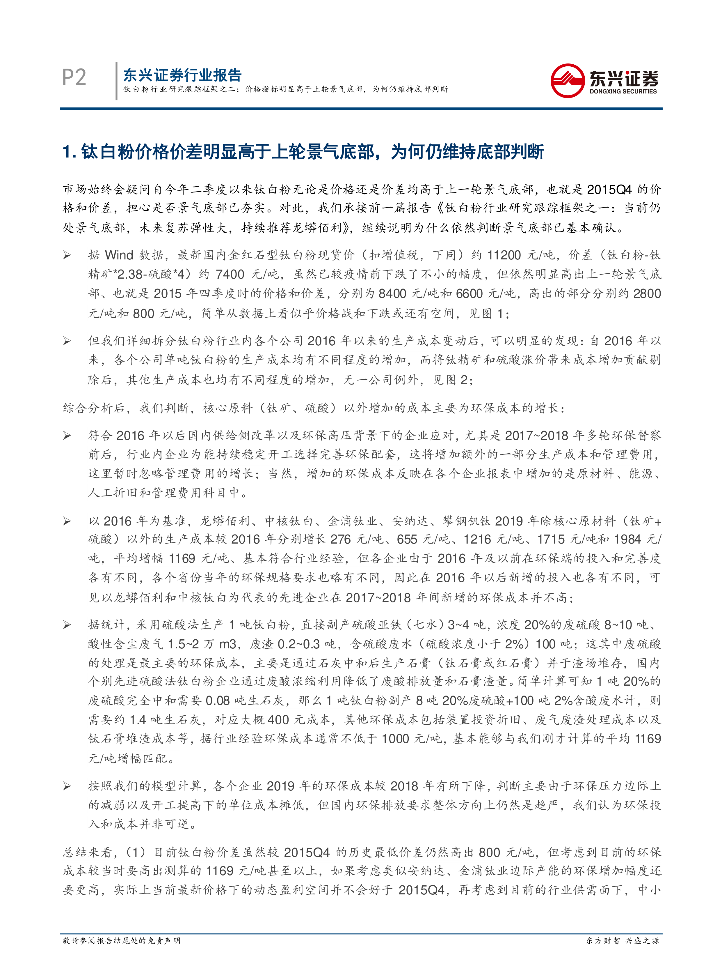 本报告的核心观点是:尽管当前钛白粉价格和价差高于2015年四季度(上一轮景气底部)的水平,但考虑到自2016年以来环保成本的显著增加,以及中小企业无力且不愿再次发起价格战,因此我们维持对钛白粉行业景气底部已基本夯实的判断,未来价格下跌空间有限。 报告强调需要动态更新成本数据,而非简单地将当前价格与历史数据进行静态比较。