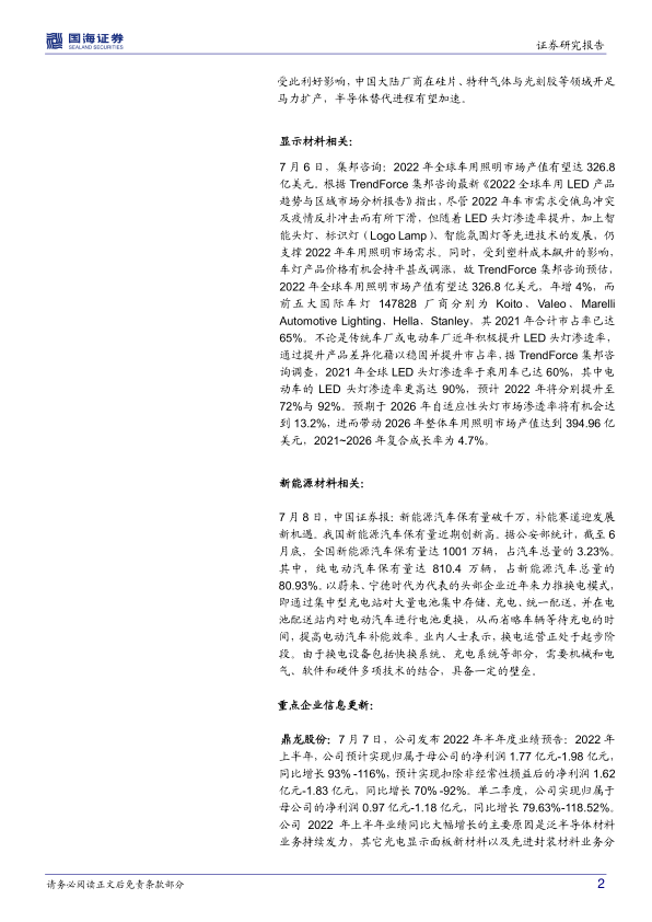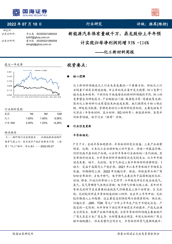 化工新材料周报:新能源汽车保有量破千万,鼎龙股份上半年预计实现归母净利润同增93%-116%