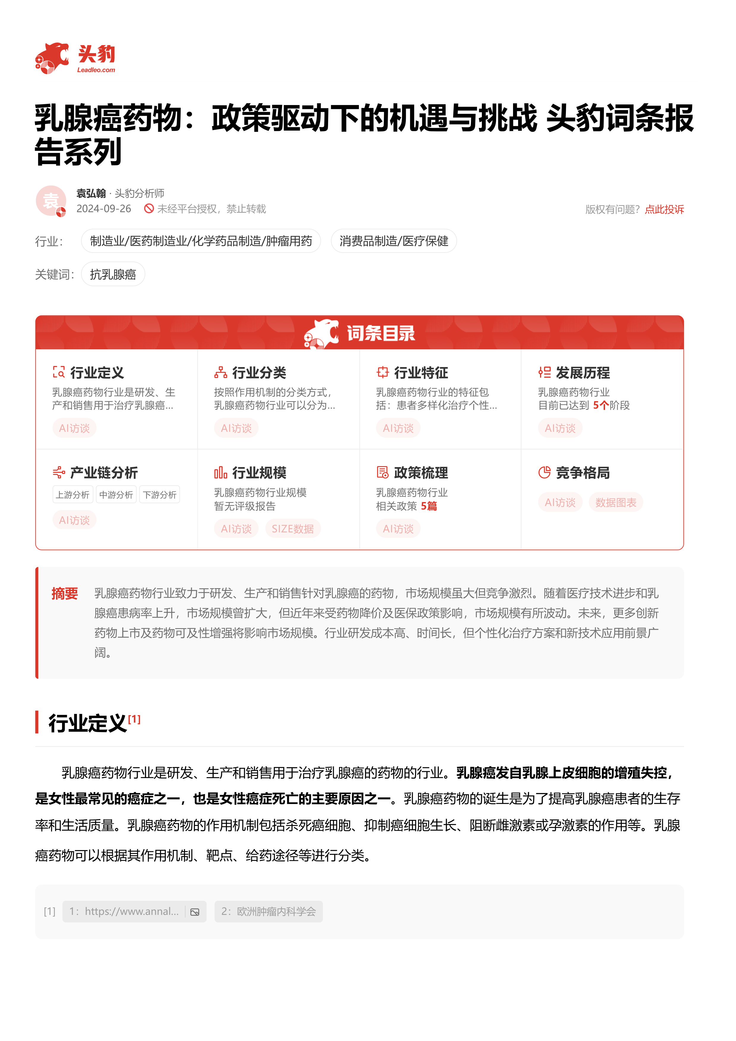 乳腺癌药物:政策驱动下的机遇与挑战 头豹词条报告系列