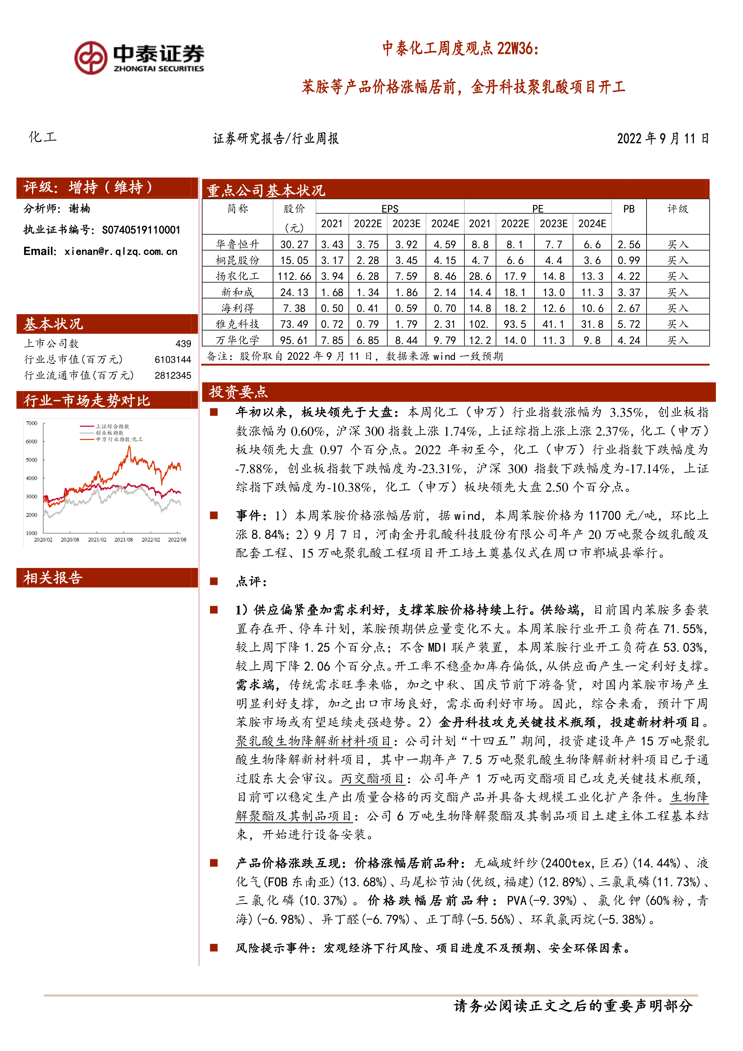 中泰化工周度观点22W36:苯胺等产品价格涨幅居前,金丹科技聚乳酸项目开工
