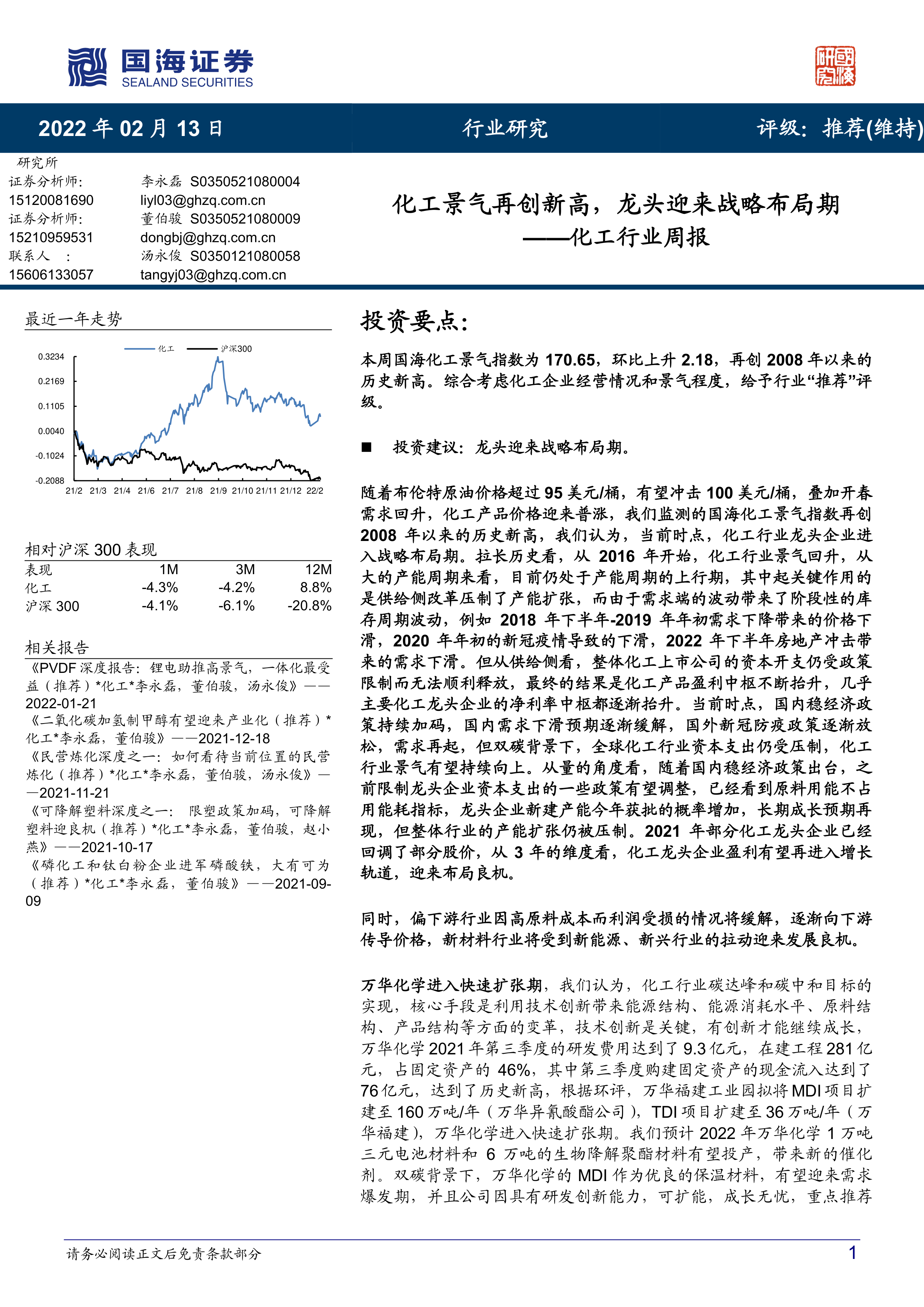 本周国海化工景气指数为 170.65,环比上升 2.18,再创 2008 年以来的历史新高。综合考虑化工企业经营情况和景气程度,给予行业“推荐”评级。